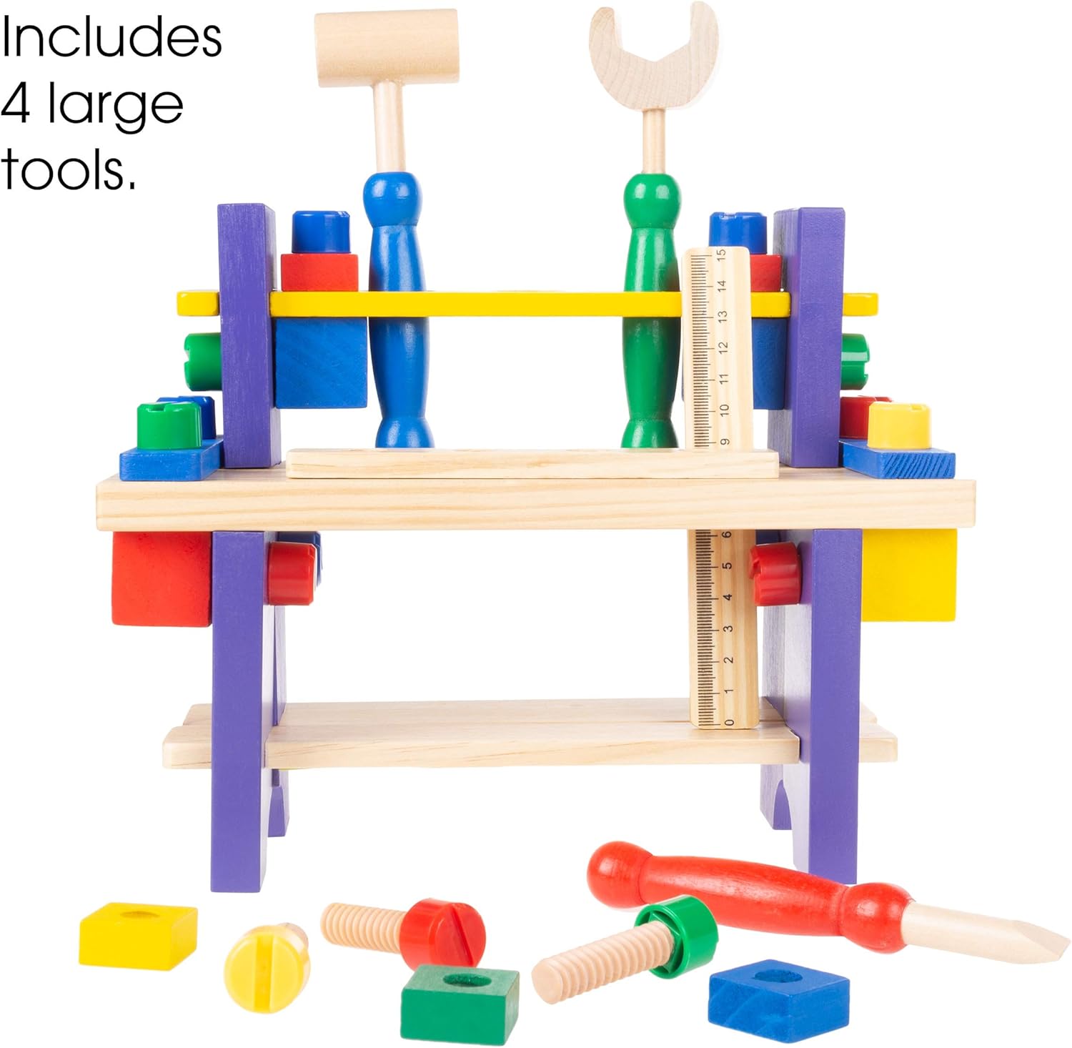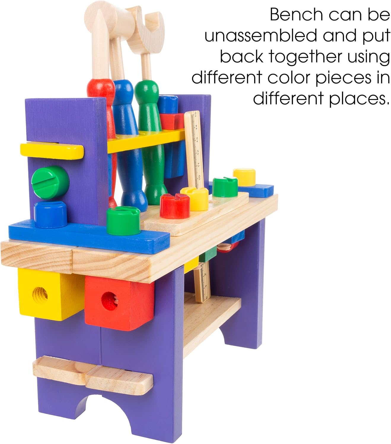 Constructed of real wood, this work bench has nicely sanded edges and is coated in bright colors, ideal for little hands and enhancing fine motor skills.