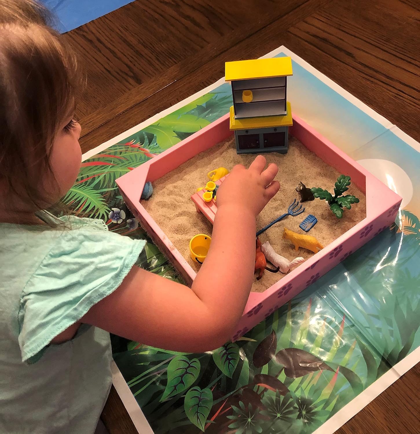 Each play set includes the wooden box, sand, no-mess play mat, themed toys to play in the sand with, and re-sealable box to keep everything together.