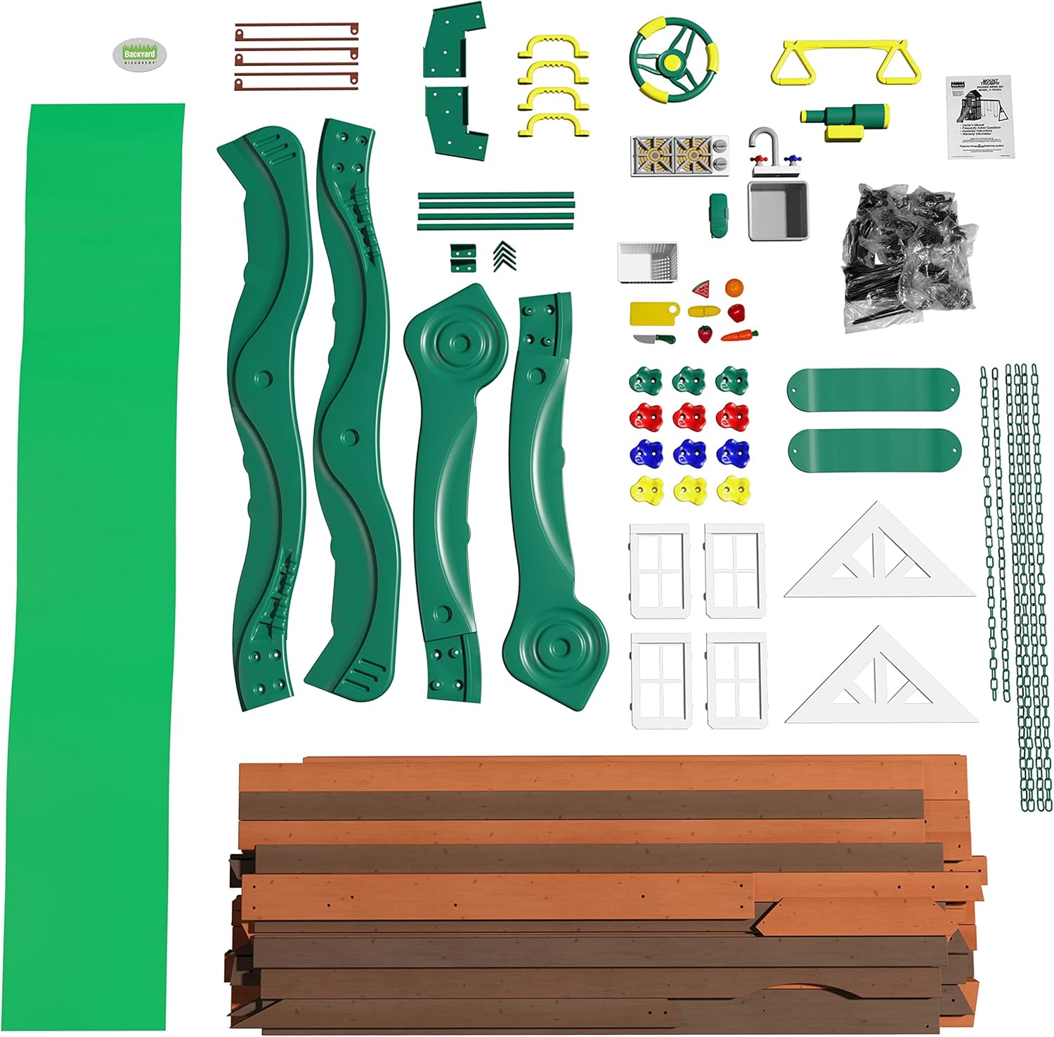 With practically a full playhouse below (complete with sink, stove, plastic food, and a 4-person picnic area) and a full clubhouse on top with its own telescope and steering wheel, you may not even notice the swings on this swing set! The challenging rock climbing wall and flat step entry ladder give everyone a quick, safe, fun way to scramble to the spacious top clubhouse, balcony and sun deck.
