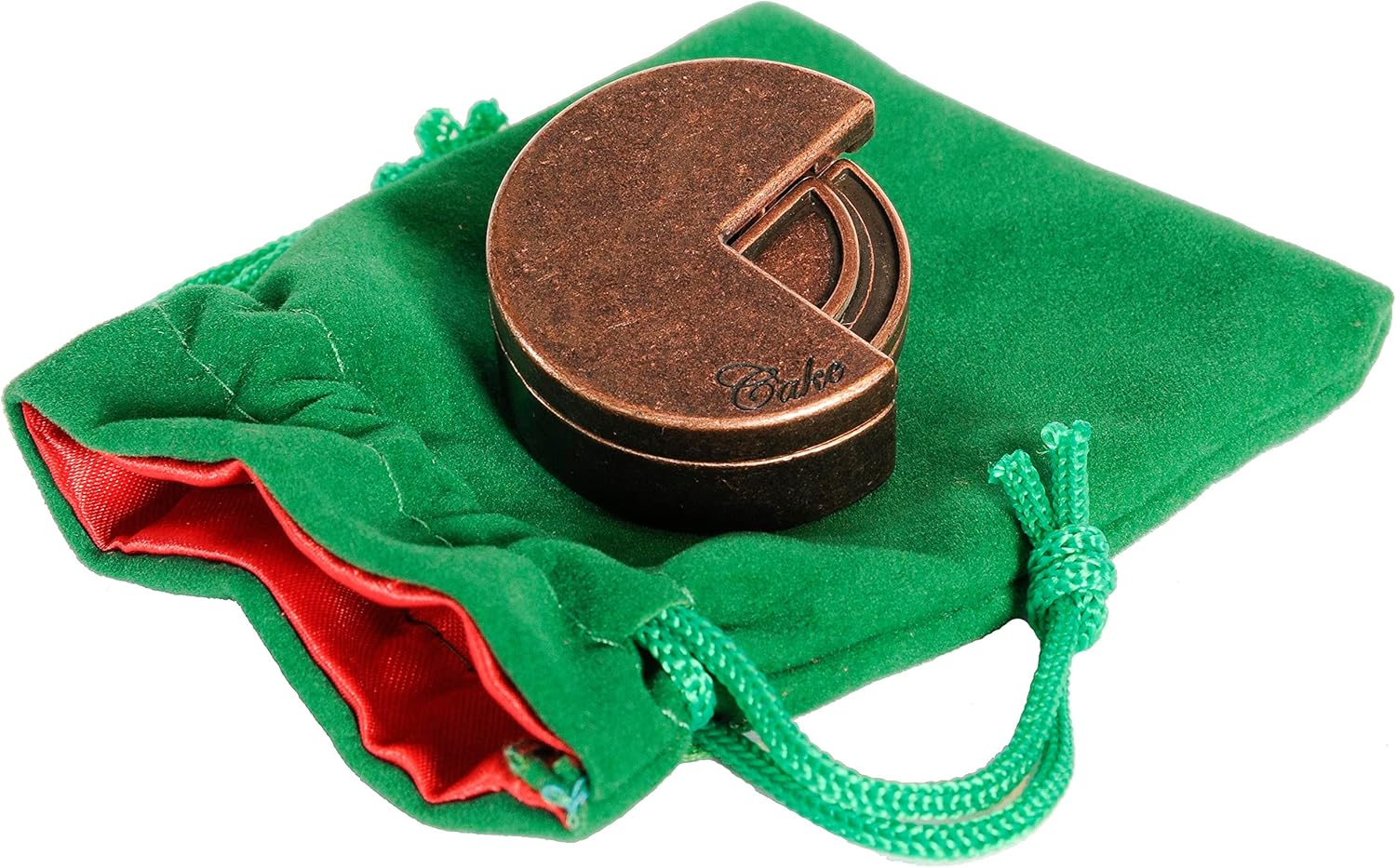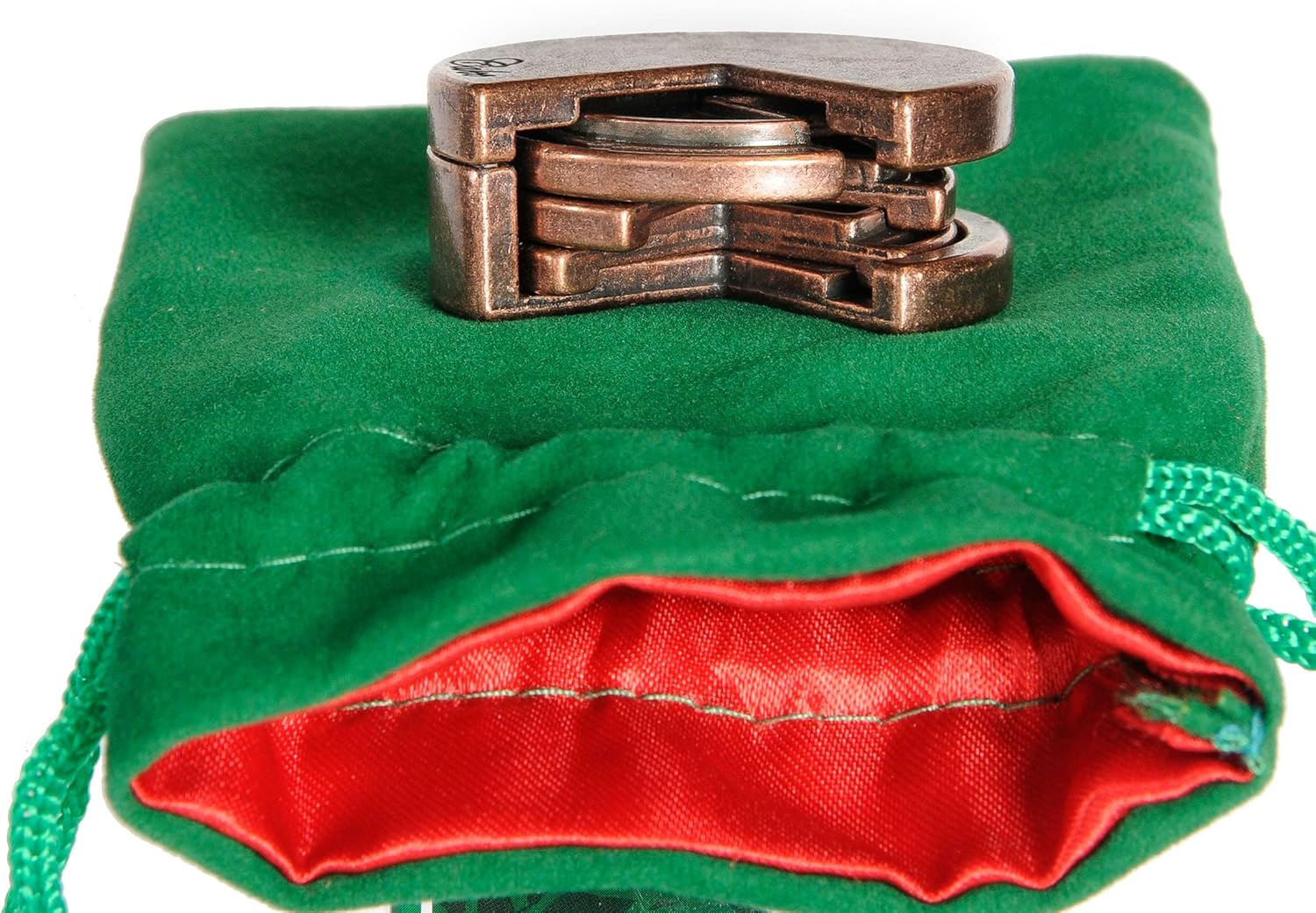 Includes 3 (three) GREEN velveteen, RED satin-lined drawstring pouches for storing your brain teaser.