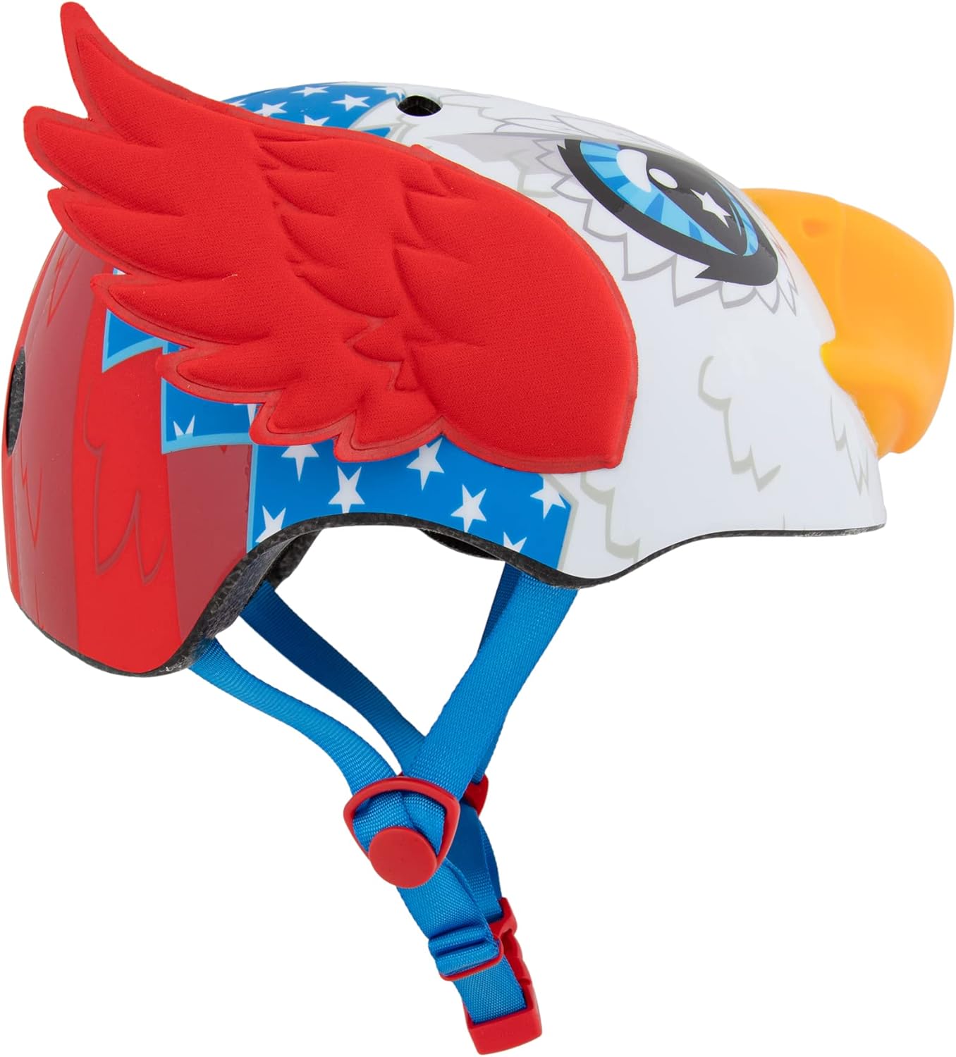 Soar like an eagle wearing the Sam Eagle helmet by Raskullz! This red, white, and blue helmet features amazing star graphics with a 3D beak and sonically welded fabric wings.