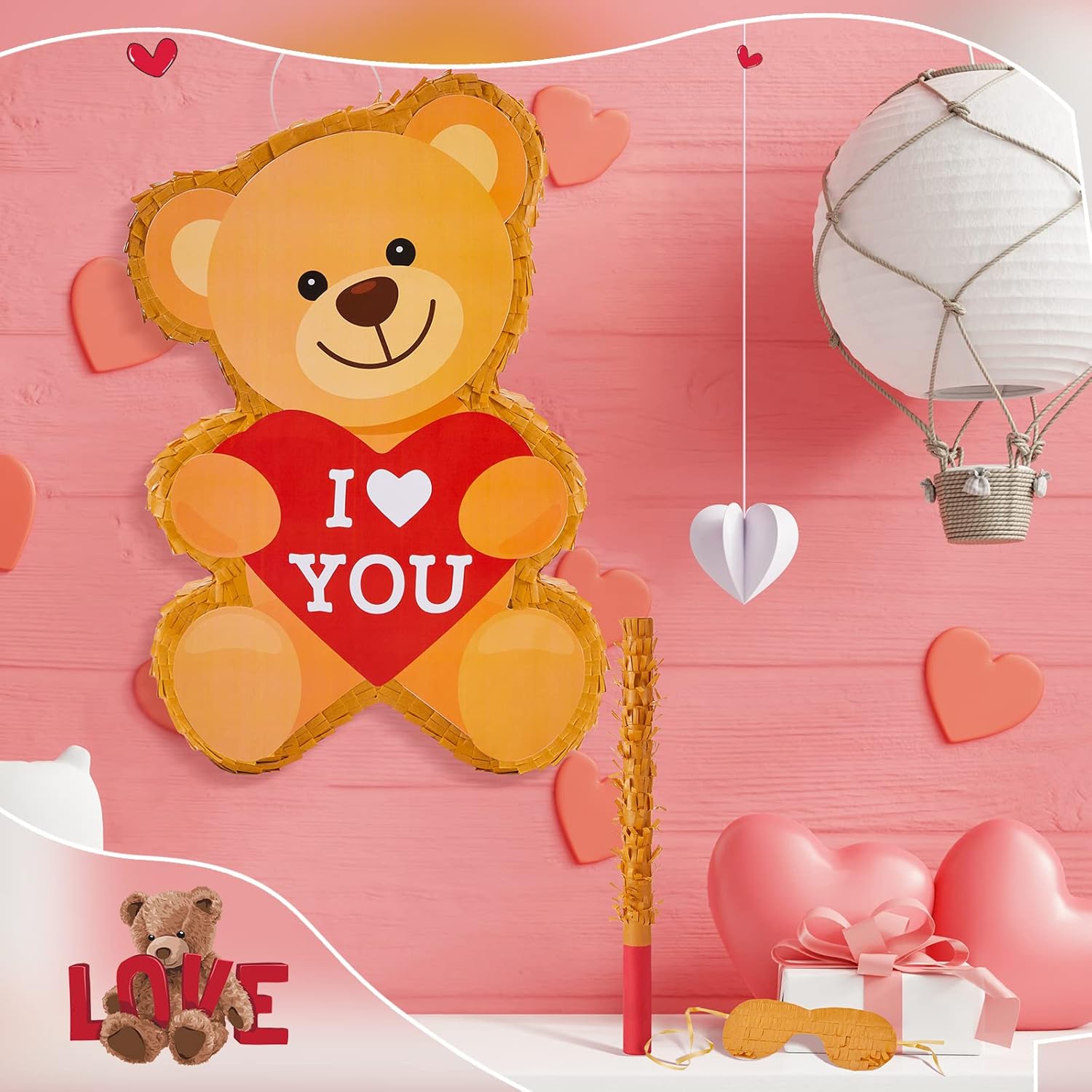 15 inches Package includes: 1 x Valentine”s Day bear pinata 1 x Pinata stick 1 x Blindfold 1 Bag of confetti Notes: Manual measurement, please allow slight errors on size.