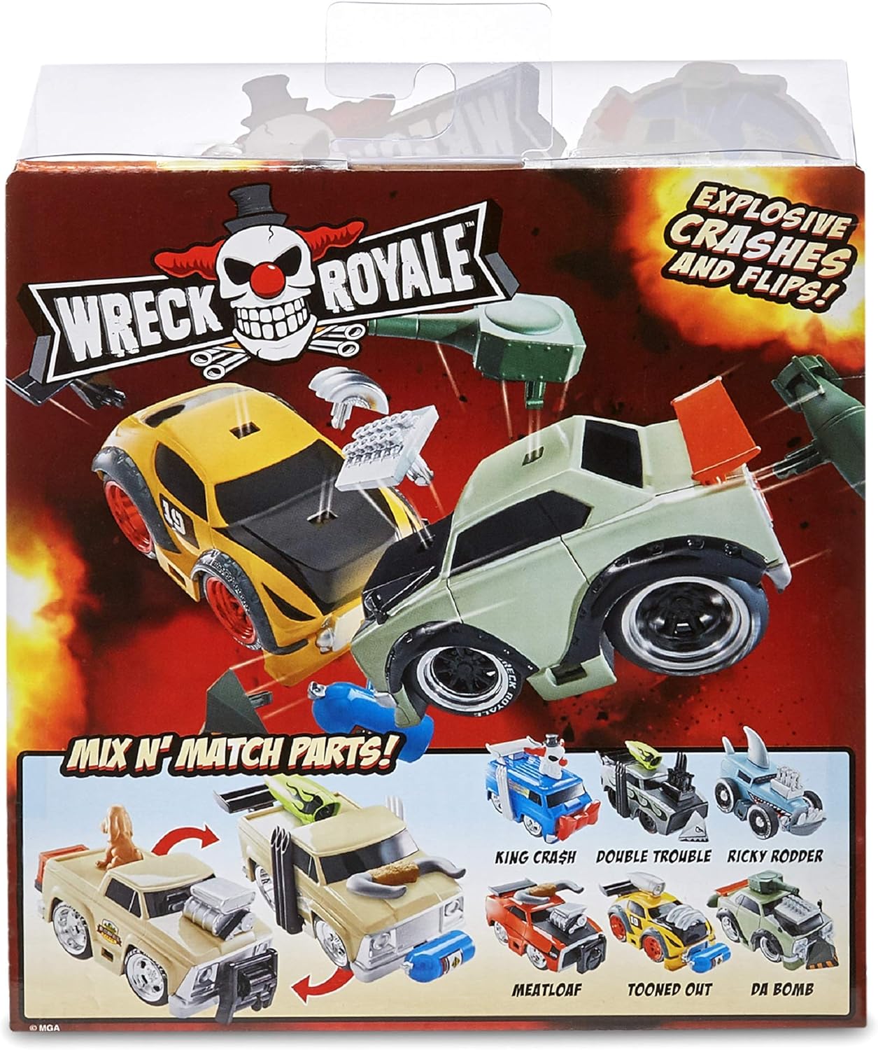 Wreck Royale cars are new crashing, ”exploding” Vehicles with mix ”N match parts that kids will totally flip for! When wreck Royale cars crash, their spring-loaded bumpers make them flip and their attached parts ”explode” In all different directions.