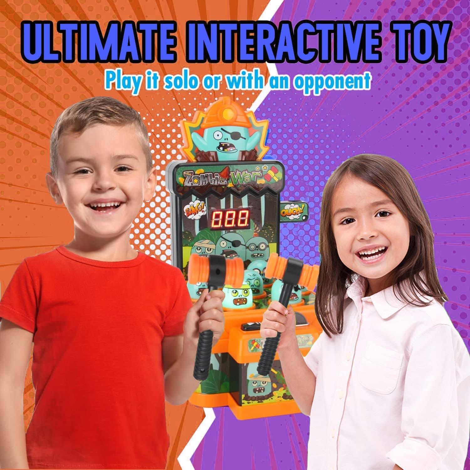 MULTIPLAYER GAMEPLAY: This mini arcade game comes equipped with 2 soft hammers for multiplayer gameplay. Challenge your friends and family to see who can smack the most zombies before the time runs out!