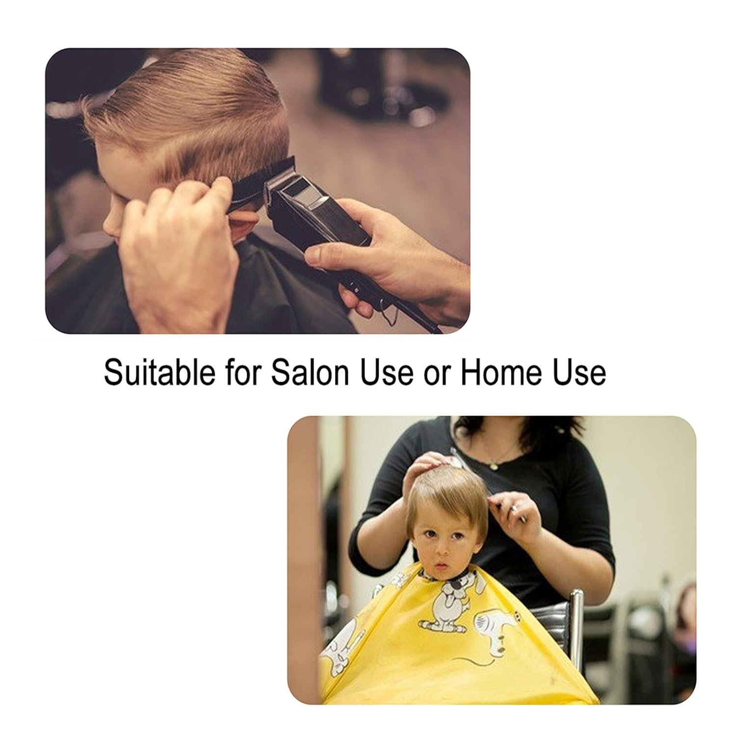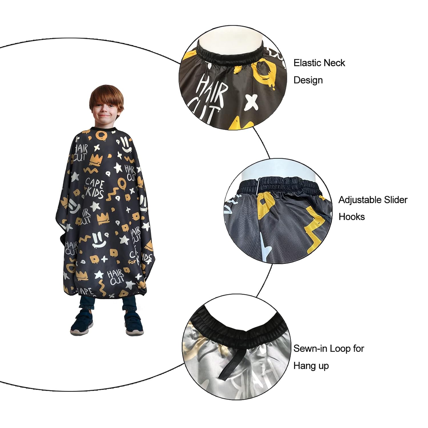 PRODUCT SPECIFICATION:High Quality Material: 100% polyesterOne Fits All: Adjustable elastic hooks designProduct Size: L47in × W39in / L120cm × W100cm(Laying Flat)Packing List: 1 Professional Kid’s Barber Cape * 1 Beautiful Package PRODUCT DESCRIPTION:Suitable for hair cutting, hair styling or other hair treatments in salon or at home.