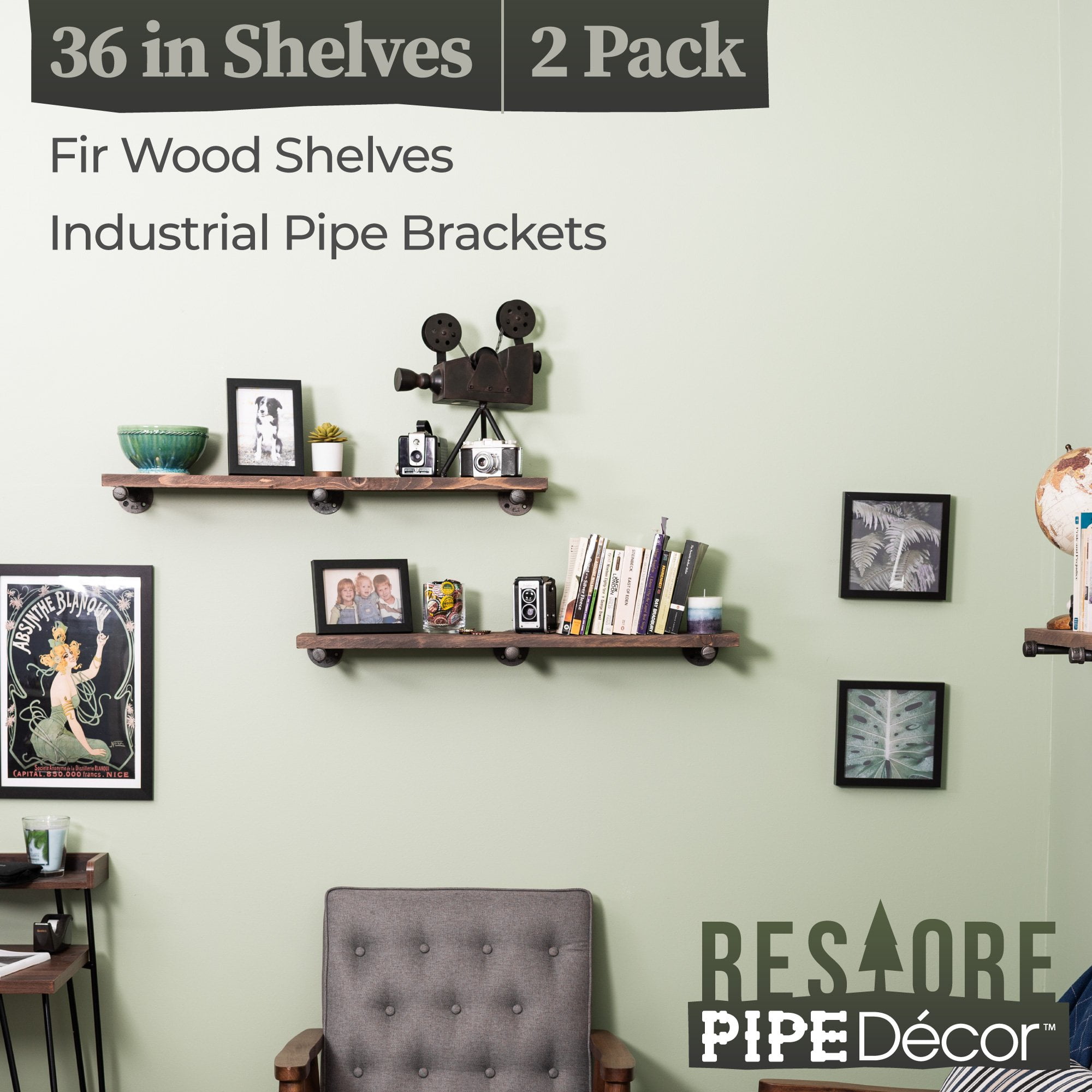 36 in. x 7.5 in. x 6.75 in. Sunset Brown Restore Wood Wall Shelving with Industrial Steel Pipe Straight Brackets