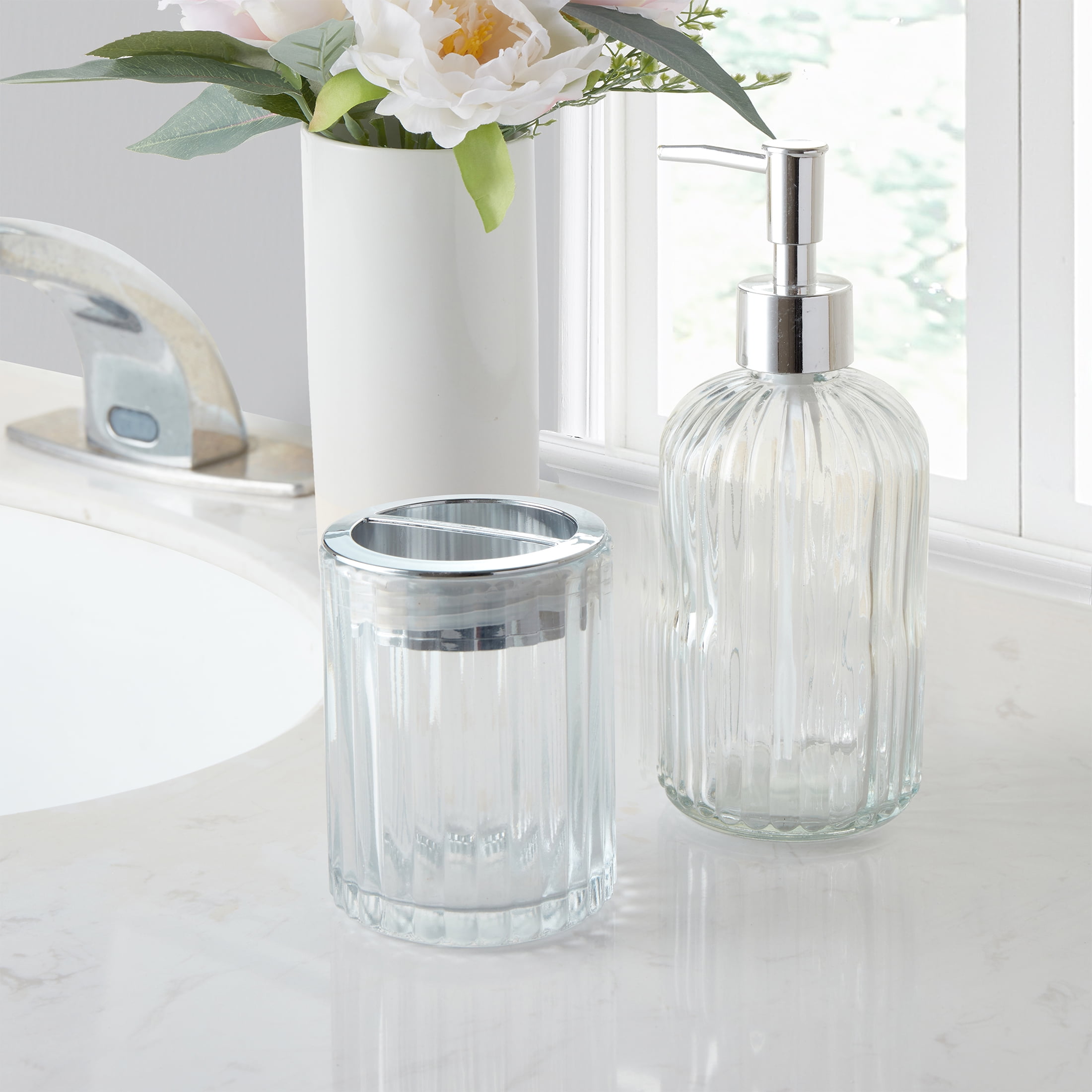 My Texas House Lancaster 12 oz. Ribbed Glass Soap Pump, Clear/Silver