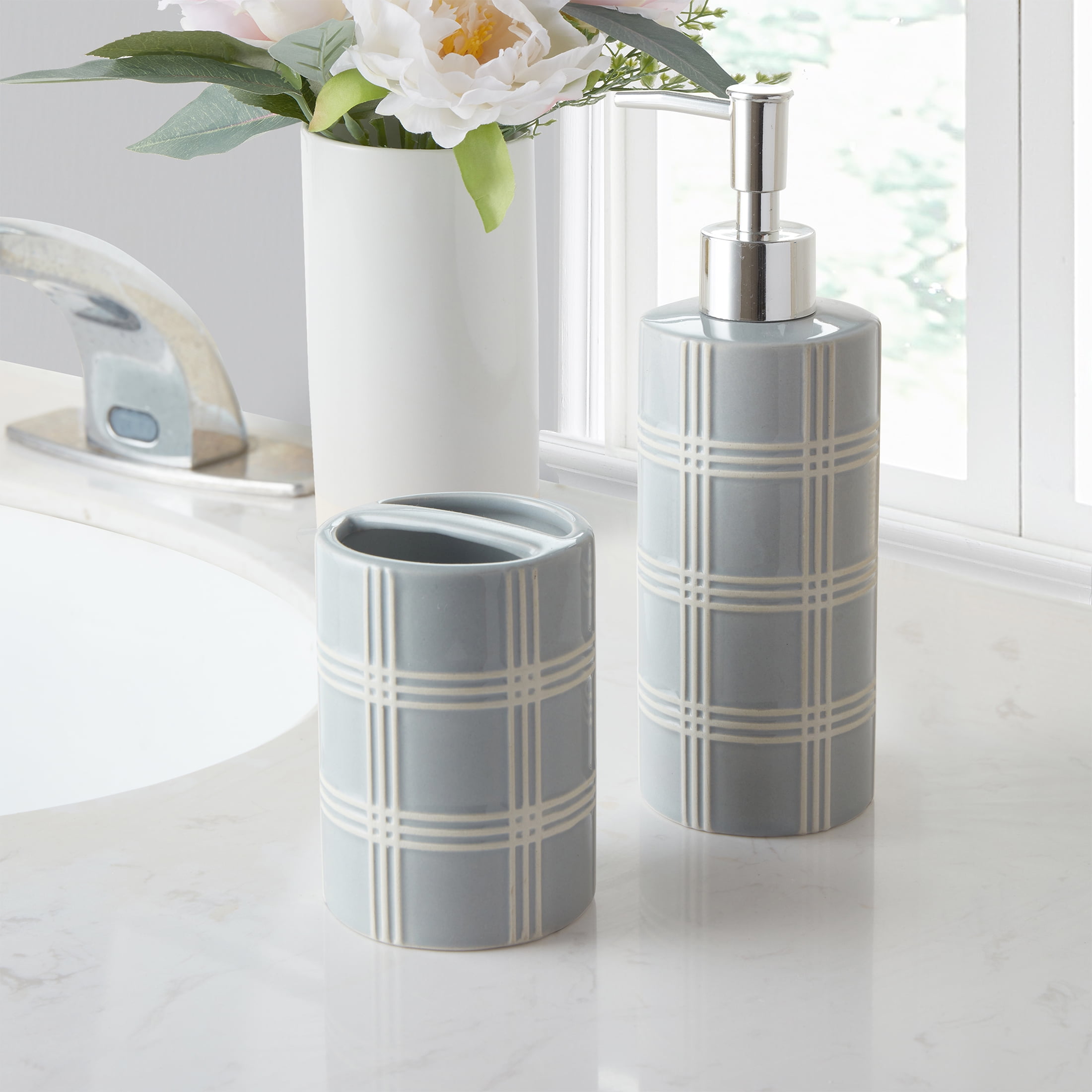 My Texas House Stafford 12 oz. Ceramic Embossed Plaid Soap Pump, White