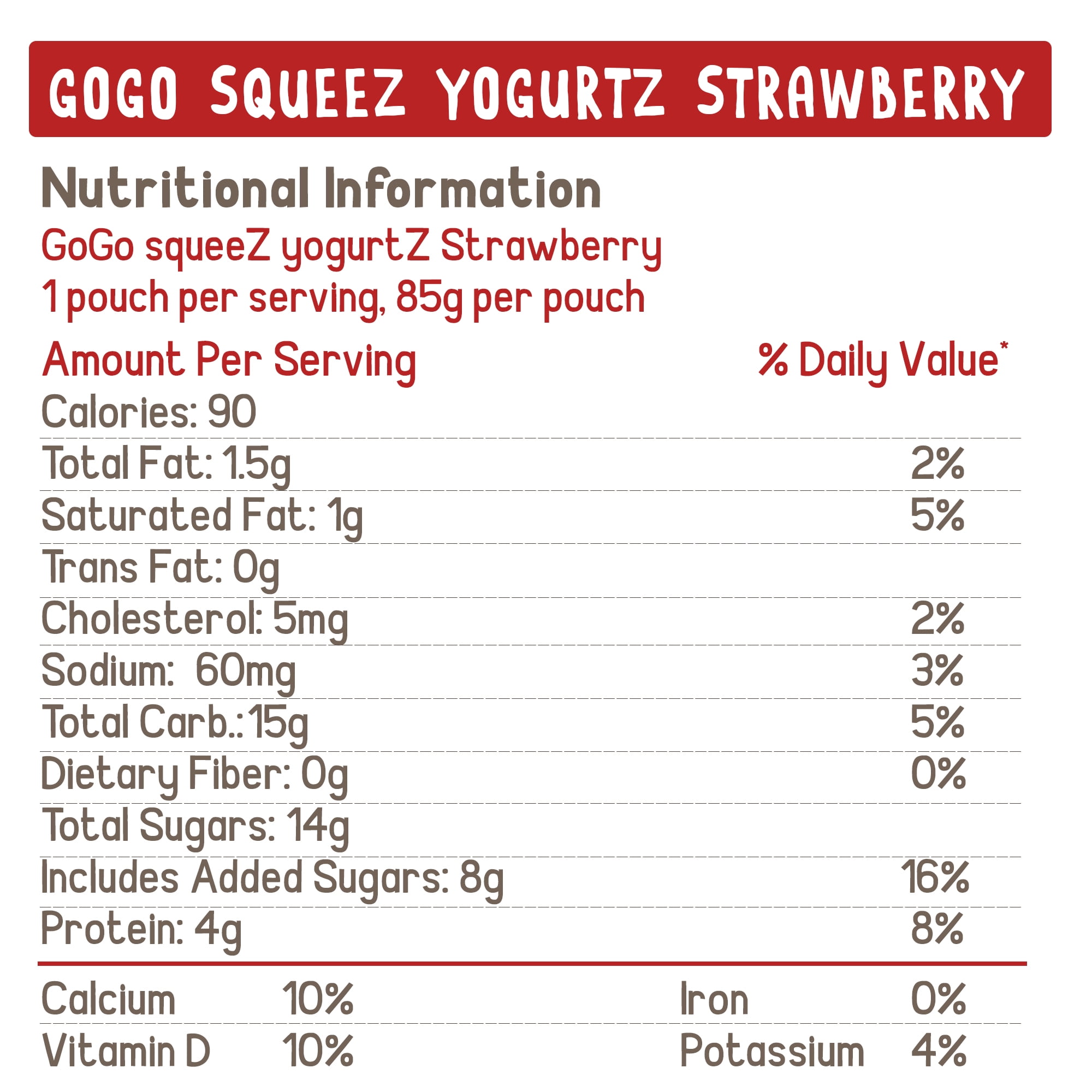 GoGo squeeZ yogurtZ are made with real low fat yogurt and strawberries, never anything artificial. Delivered in our iconic squeezable, portable snack pouches, GoGo squeeZ yogurtZ is safe to store at room temperature until opened. Our kitchen pantry friendly yogurt is a delicious snack with no preservatives and no fridge needed! Our fruit yogurt pouches are kosher certified, nut free and gluten free snacks, are made with no artificial growth hormones like rBST* and are a good source of Calcium and Vitamin D**.