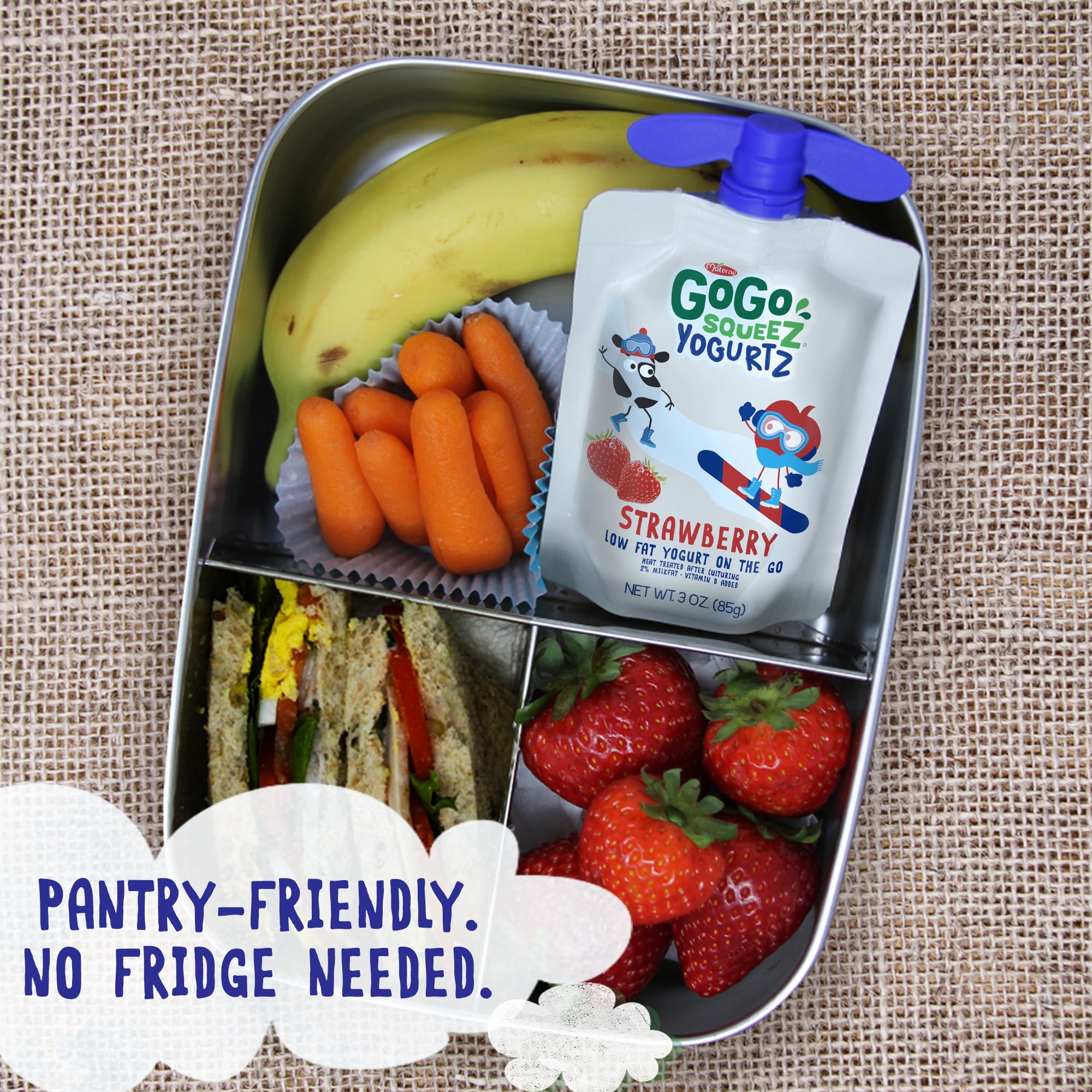 - A delicious snack with nothing artificial and no fridge or cooler needed! GoGo squeeZ yogurtZ is a pantry-friendly yogurt pouch!