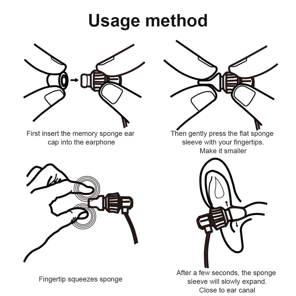 Rub the memory sponge to the minimum before entering the ear (about 5 seconds of rebound time, the longer the rebound time, the better the quality of the memory sponge) Squeeze into the ear, the sponge will slowly expand and fill up slowly according to different ear canals.