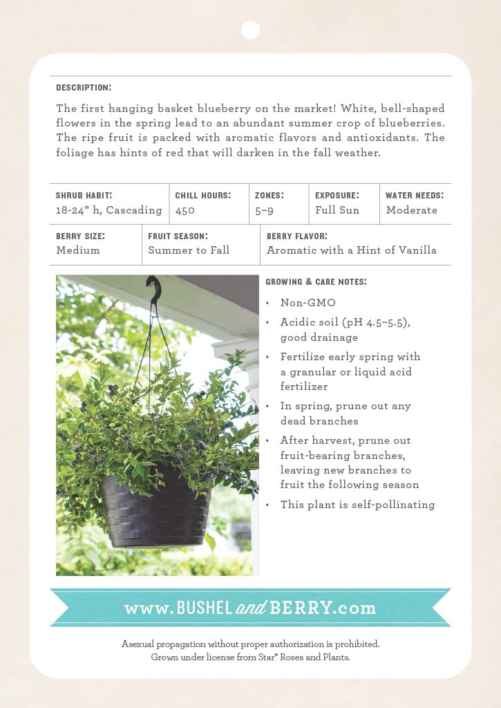 The first hanging basket blueberry on the market! White, bell-shaped flowers in the spring lead to an abundant summer crop of blueberries. The ripe fruit is packed with aromatic flavors and antioxidants. The foliage has hints of red that will darken in the fall weather.