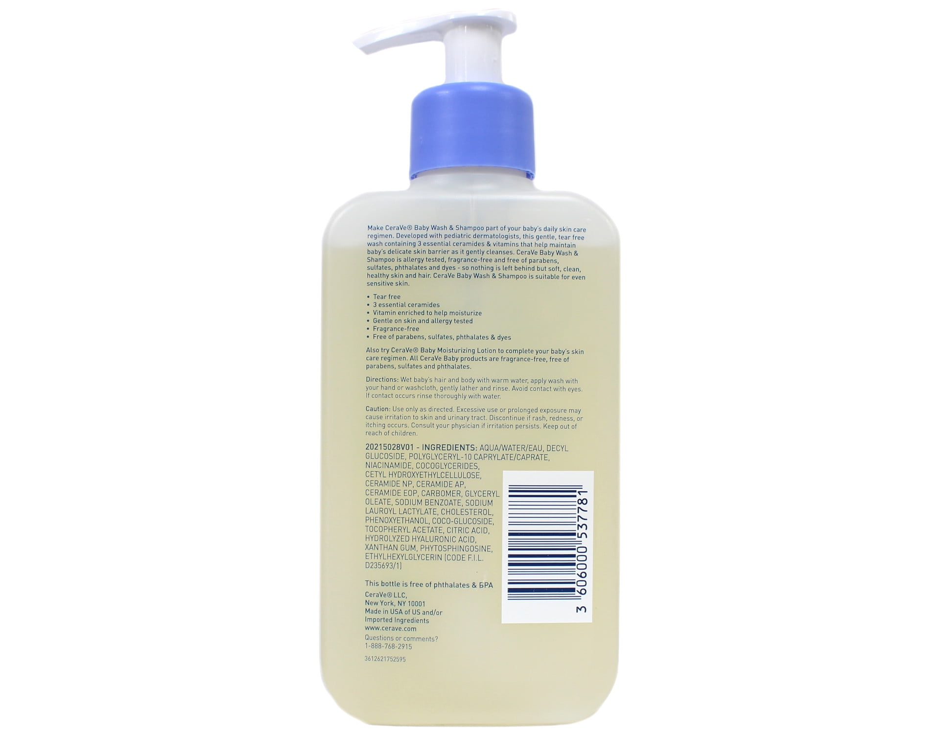 - 2 Pack of CeraVe Baby Wash & Shampoo with Essential Ceramides & Vitamins, 8 oz each.