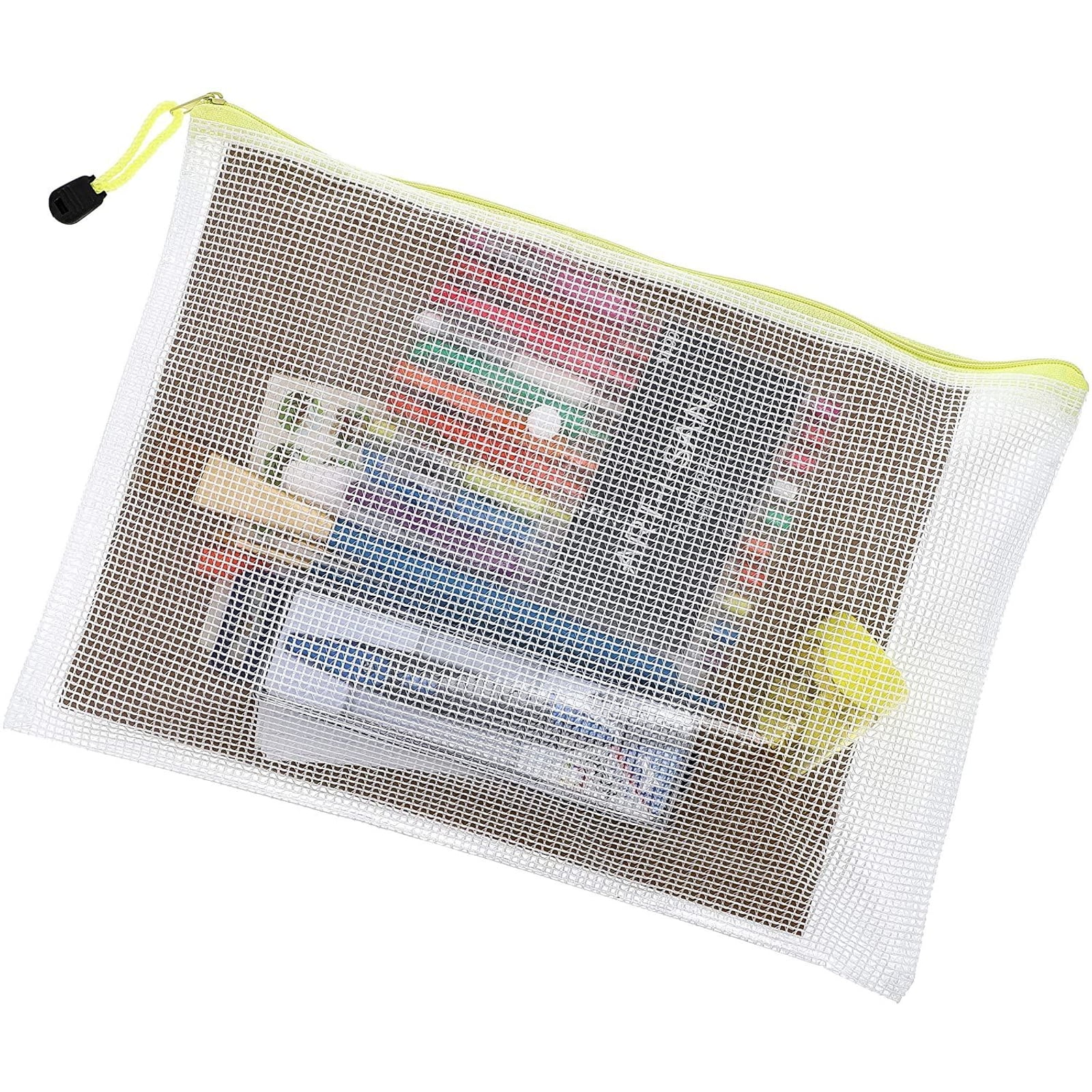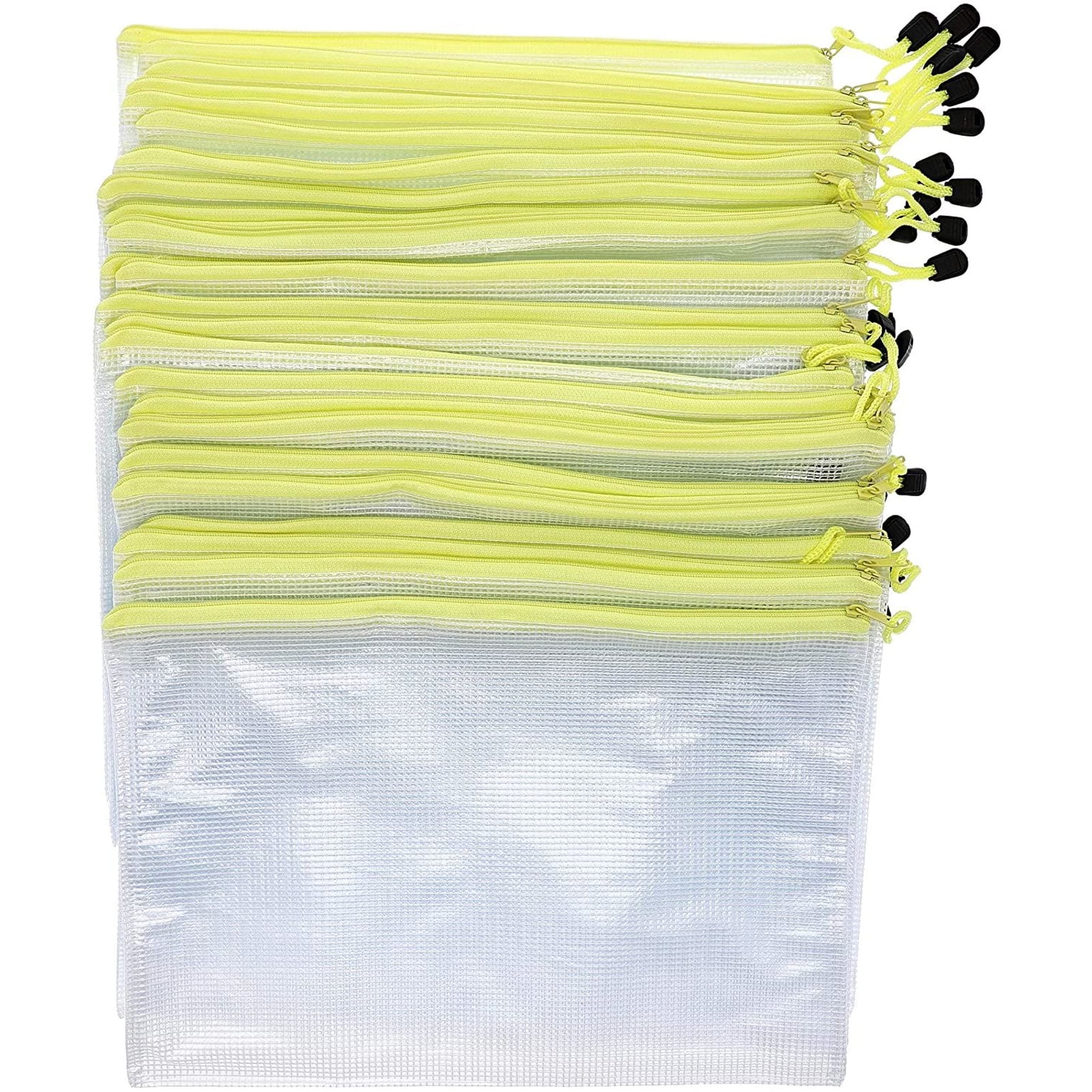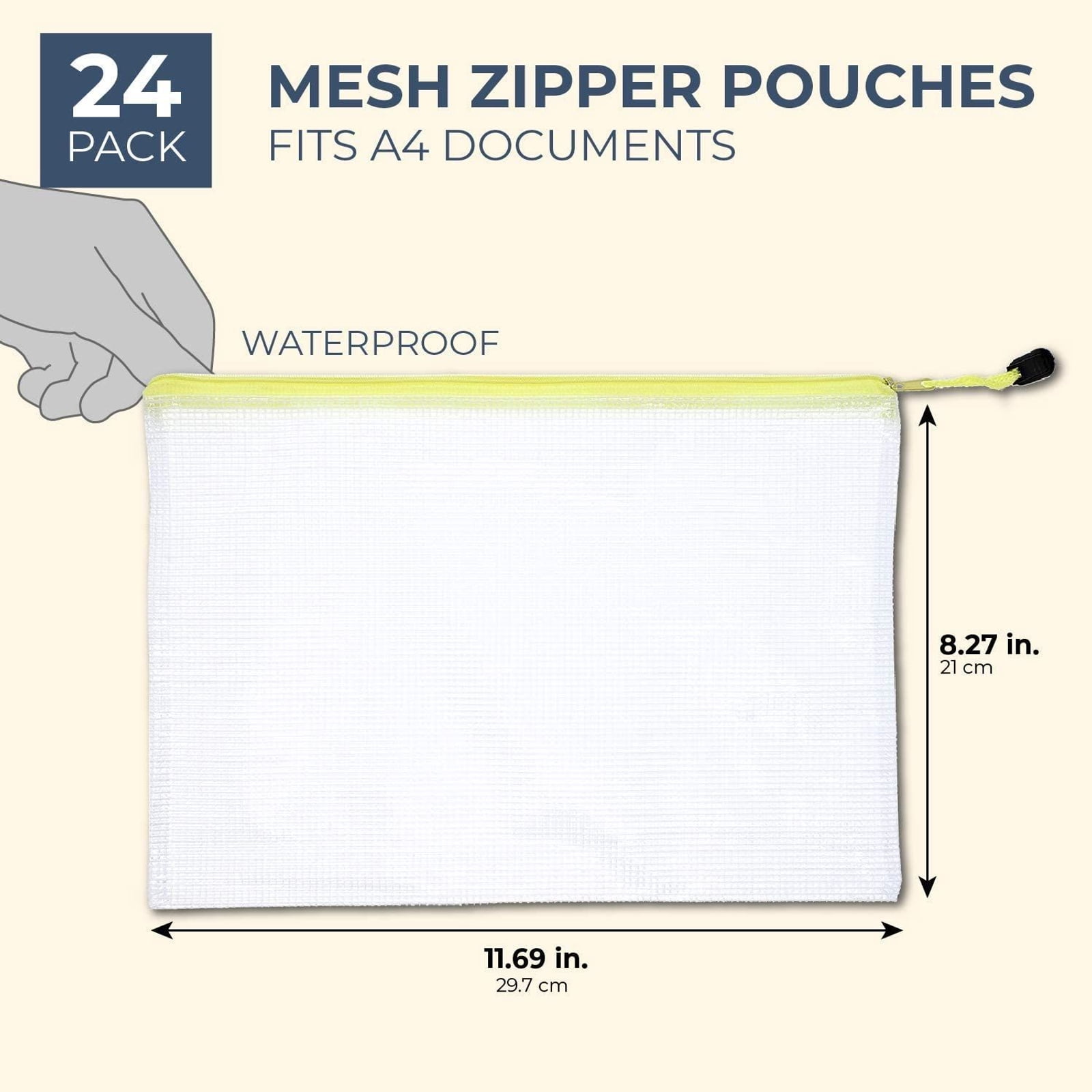 24 Pack large mesh document pouches with zipper closure. Great for school, home, or office use and ideal for storing papers, office supplies, pencils, small books, etc. Size fits up to A4 documents (8.27 × 11.69 inches)