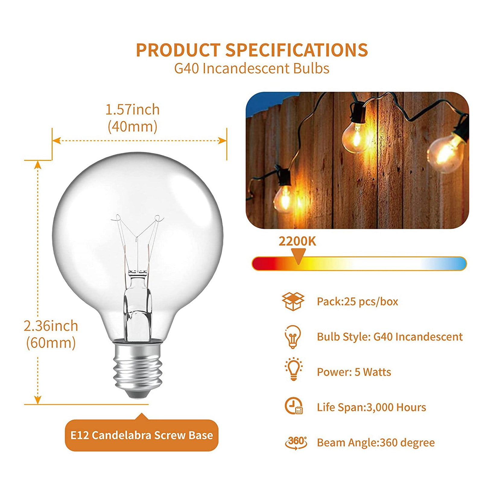 25Pcs G40 Replacement Light Bulbs E12 Candelabra Screw Base LED Globe Bulbs for Indoor Outdoor String Lights Warm White
