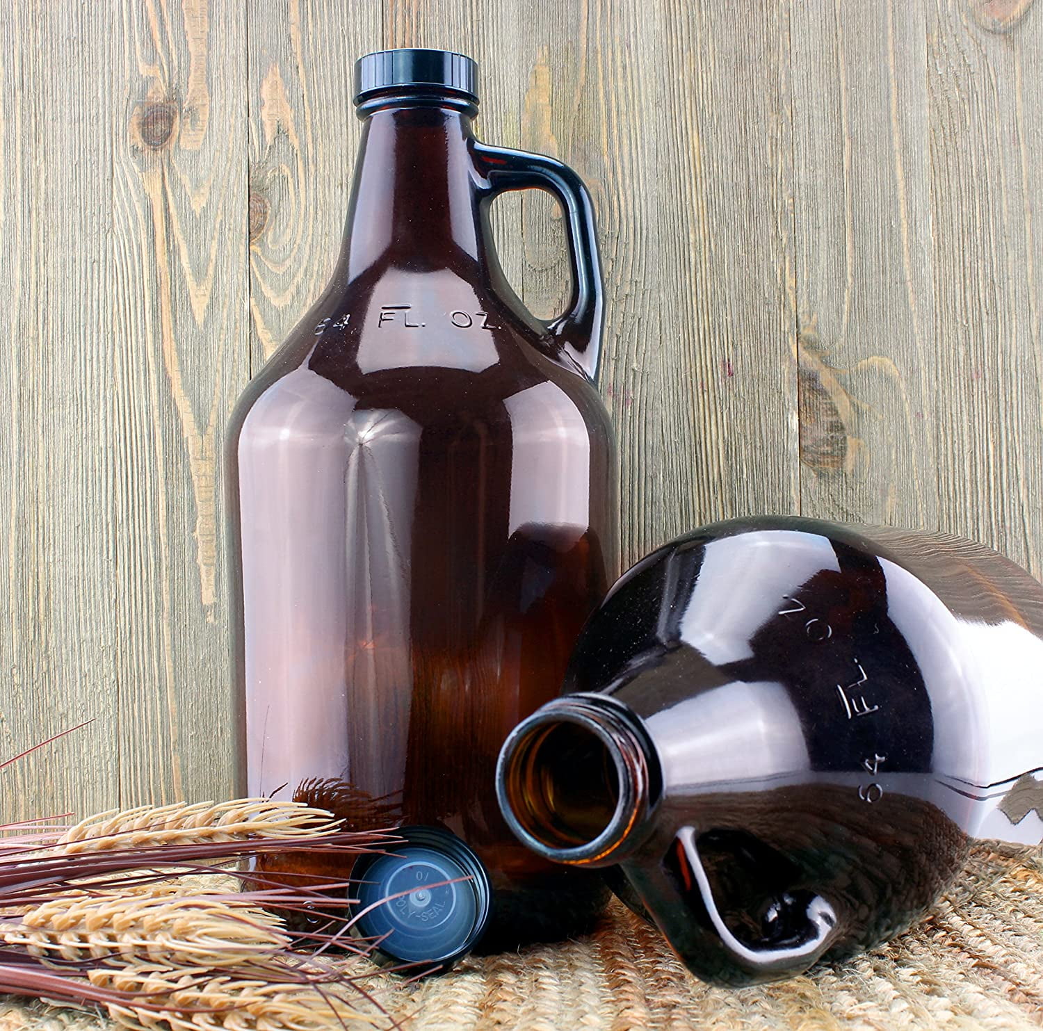 64oz Amber Glass Growler Jugs 64-Ounce (2-Pack) 2-Quart Bottles w/Black Phenolic Lids