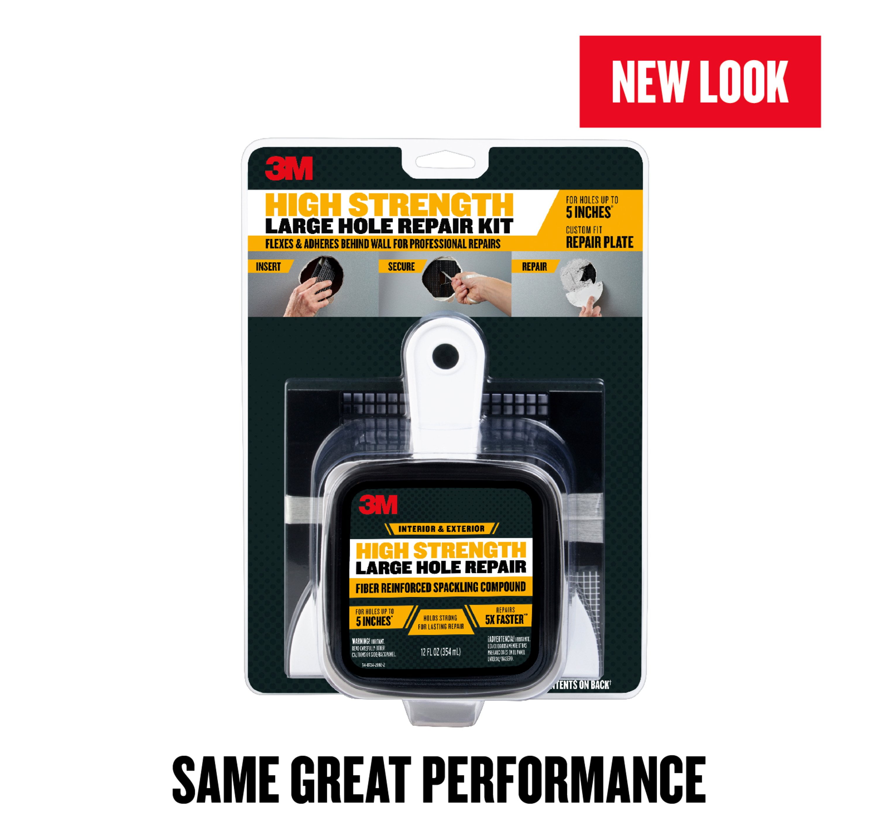 3M™High Strength Large Hole Repair Kit includes all necessary tools for a interior or exterior repairs up to 5". Kit includes 6" putty knife, fiber reinforced spackling compound, 5.5"x6" repair plate, fiber tape, and sanding pad.