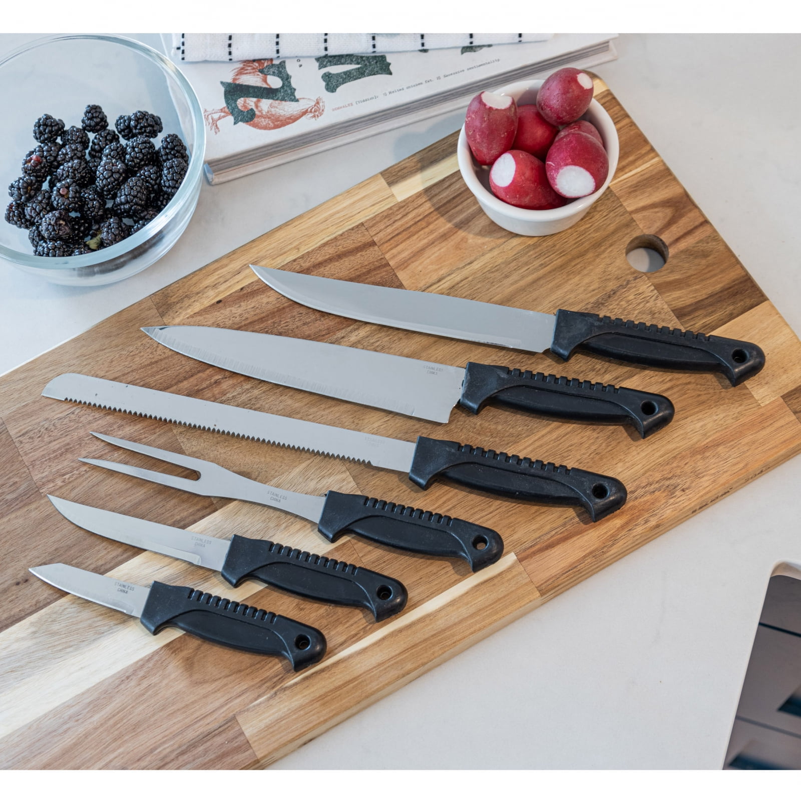 - QUALITY CONSTRUCTION – Constructed of high quality stainless steel that won’t rust, this kitchen knife set features a comprehensive collection of knives that will quickly meet all your food prep needs. The molded plastic handles and steel blades will stand the test of time!