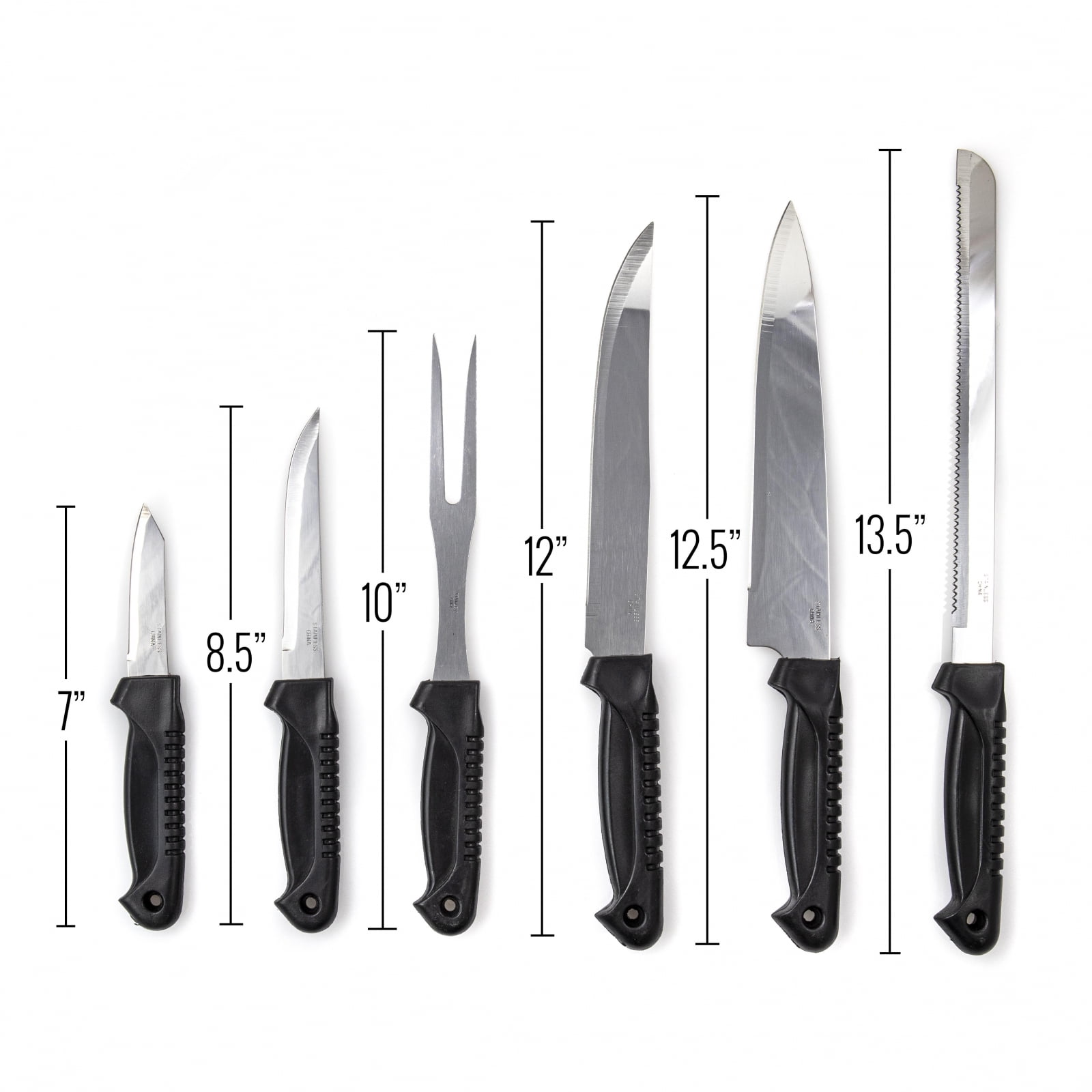 The all-in-one complete 6 piece knife set includes a 13.5” Ham knife, 12.5” Chef knife, 12’ Carving knife, 10” Fork knife, 8.5” Utility knife, and 7” Paring knife, all with ergonomic handles providing a strong, reliable grip when cutting and chopping.
