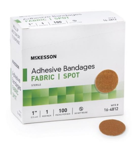 McKesson Adhesive Bandages – Fabric Spot1" (2.5 cm) RoundFlexible, durable fabric.Stretchable for added comfort.Helps protect cuts and scrapes by conforming to skin with an absorbent, non-stick pad.Sterile individual packages help promote cleanliness and further protect against infection.Features comfortable fit, long-lasting adhesive.SterileAdhesive Spot Bandage, McKesson, 1 Inch Fabric Round Tan Sterile, 16-4812 – Pack of 100