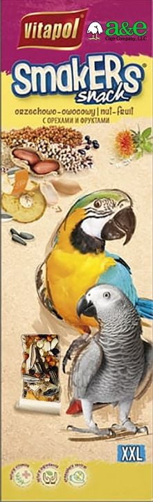 Vitapol Smakers Snack contains natural ingredients of the highest quality in carefully selected proportions. These snacks with their unique tastes and nutritional characteristics are intended for ornamental birds and parrots. The form of the Smakers stimulates the natural eating habits of birds in the wild. The structure of the snack consists of three layers including the base made of millet grain, a nutritious wheat layer, and an individually designed external mixture. The size of the Smakers is matched to the sizes of the various species of birds and their feeding capabilities.