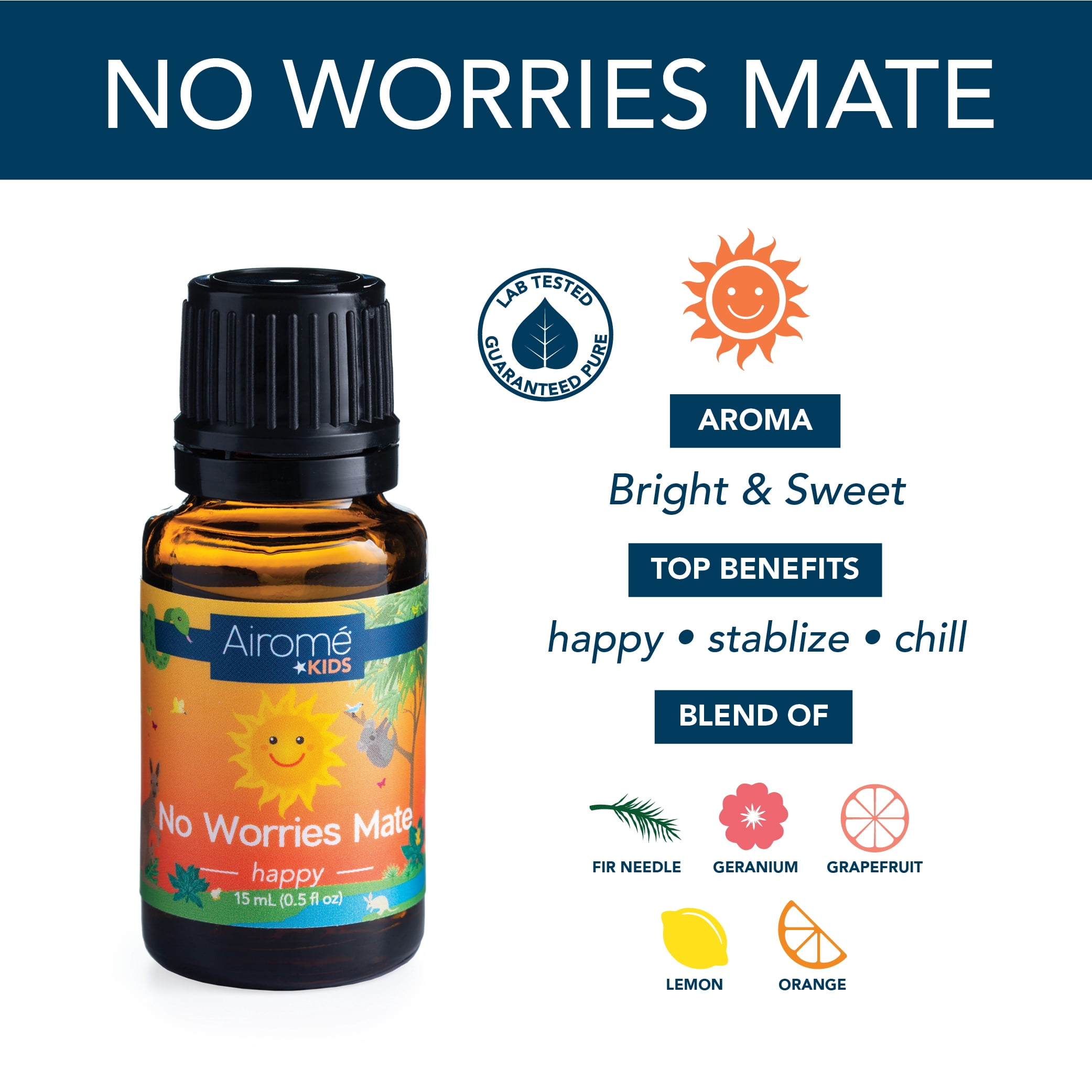 - Kid-Safe Blend of: Fir needle, geranium, grapefruit, lemon, orange. Airome No Worries Mate Kids Blend is a childrens happy blend that is bright and sweet. No worries mate! Enjoy this bright and sweet blend. Diffuse it to brighten the mood or to help create a balanced environment for your little joeys.