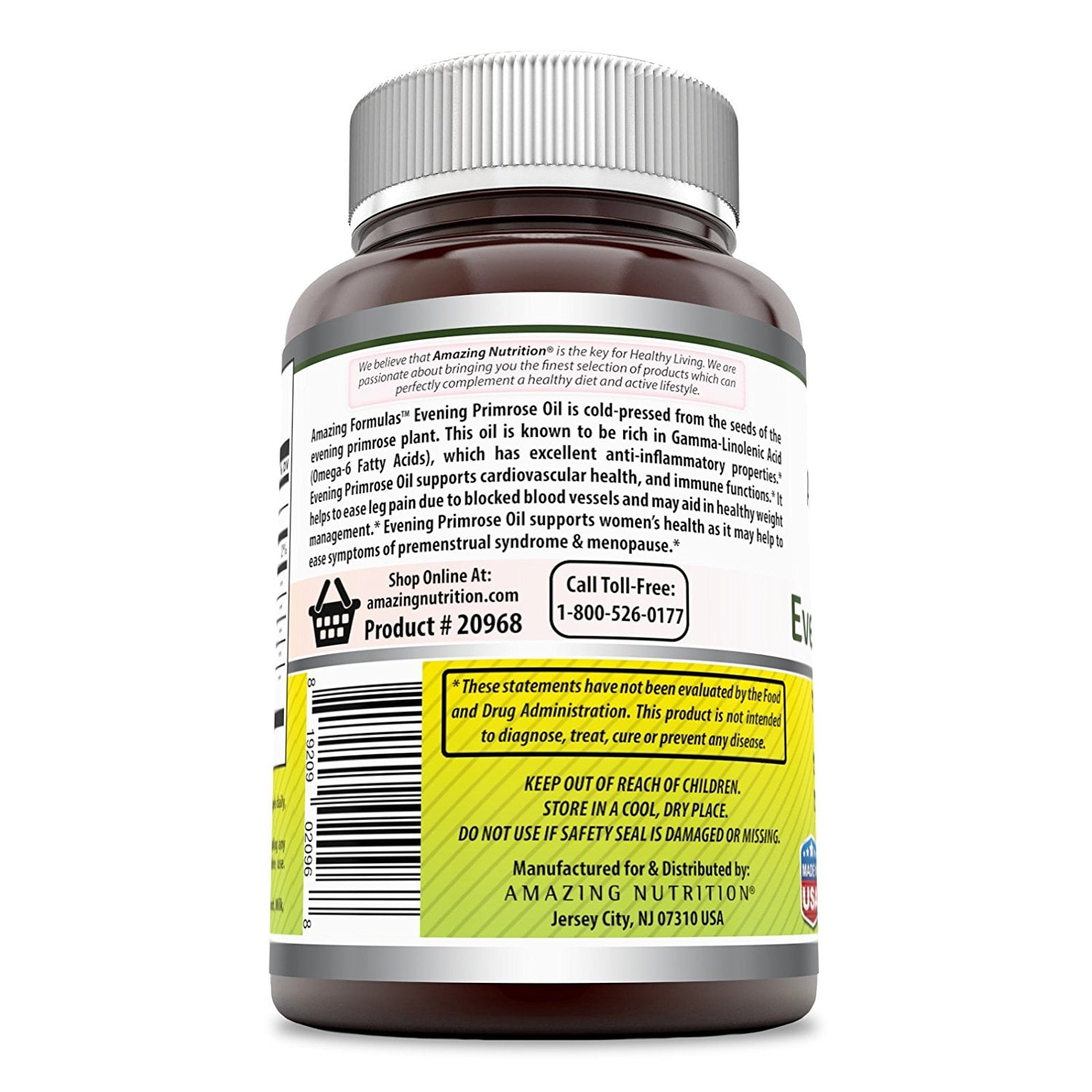 AMAZING FORMULAS EVENING PRIMROSE OIL DIETARY SUPPLEMENT-1300 MG, 120 SOFTGELS Evening Primrose is a beautiful yellow flower that growsthroughout North America. For centuries, the oil from the seeds of the planthave been used for its numerous health. Evening Primrose oil is rich in: Omega6 Fatty Acids (such as Linoleic Acid & Gamma Linoleic Acid), Omega 9 FattyAcids (such as Oleic Acid), Anti-Inflammatory Compounds, Vitamin E etc.Amazing Formulas Evening Primrose Oil dietary supplement is made Non-GMO,Hexane Free, Cold Pressed Evening Primrose seed oil. Each softgel provides1300milligrams of pure and concentrated oil. It is standardized to contain 10%Gamma Linoleic Acid (GLA) for better results. BENEFITS OF EVENING PRIMROSE OILANTI-INFLAMMATORY PROTECTION Evening Primrose oil is an excellent naturalanti-inflammatory. The high GLA content of our evening primrose oil dietarysupplement may help to alleviate inflammation symptoms such as joint, nerveand muscle pains. WOMEN���S HEALTH For centuries Evening Primrose Oil isconsiders as a natural remedy to alleviate unwanted PMS and Menopause symptomsbecause of its essential fatty acid content. Getting enough omega-6 fattyacids, such as LA and GLA may support overall hormonal function within thebody. SUPPORTS HEALTHY SKIN Gamma Linoleic Acid (GLA) is necessary forideal skin structure and function. Because the skin can���t produce GLA on itsown, taking GLA-rich Evening Primrose Oil dietary supplement may help topromote overall skin health. It may help to smooth skin by promoting itselasticity, moisture, firmness etc. Read more AMAZING FORMULAS We believe thatbalanced nutrition is the key for healthy living. We are passionate aboutbringing you the finest selection of products which can perfectly complement ahealthy diet and active lifestyle. We are constantly expanding our line-up offormulas to be a one-stop shop for all your health and wellness needs. OURMISSION & VALUES We believe nothing is more important than your health. Ourgoal is to get you living well and feeling better and we want to make it easy!We understand that getting all the nutrients you need on a daily basis can bea difficult task. It can seem daunting to incorporate the recommended amountof fruits and vegetables, high-fiber, whole grains, healthy fats and leanprotein into your busy day. Amazing Nutrition has all the best vitamins tohelp you get all right nutrients daily. OUR COMMITMENT We only use ingredientsfrom suppliers that meet our stringent standards. Additionally, every singleproduct is subjected to countless quality tests to ensure purity and fullpotency. All our products are A at a GMP facility.