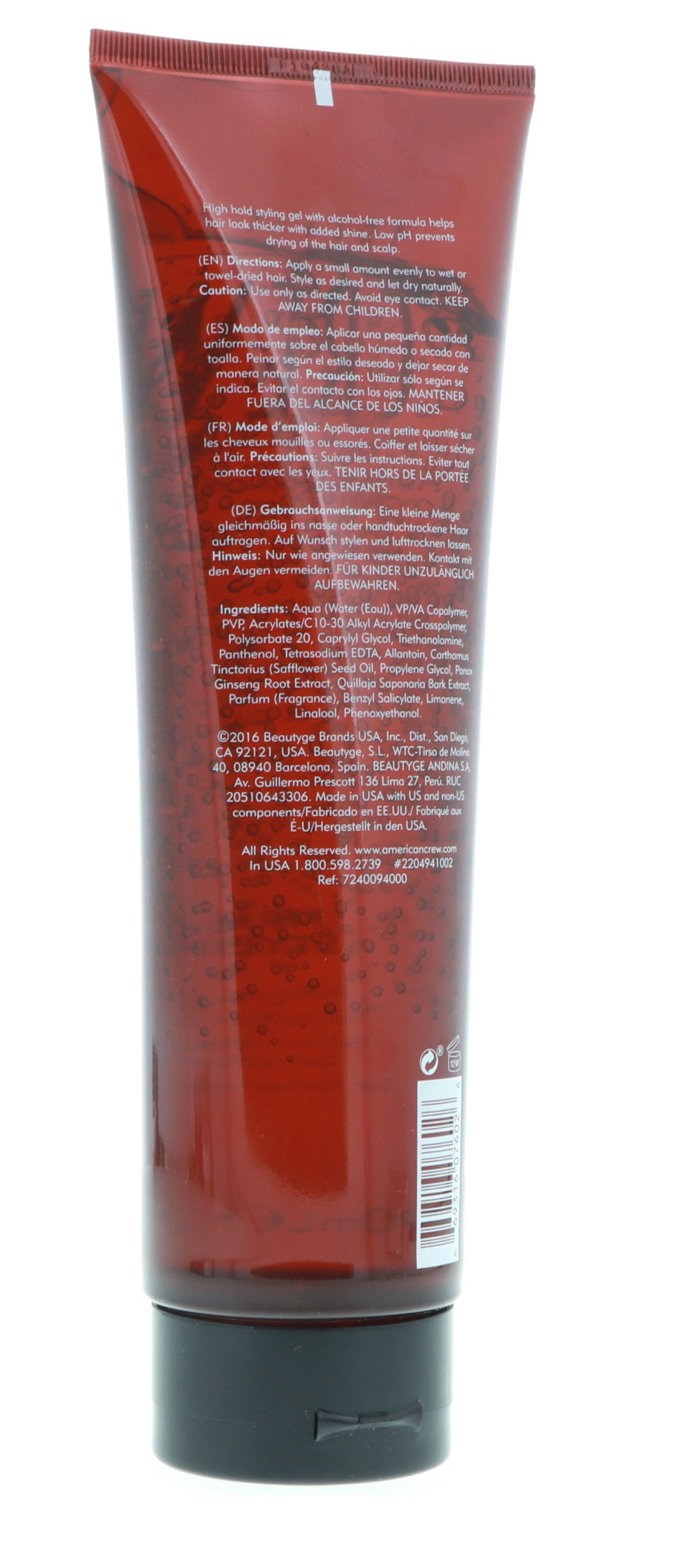 Provides very high hold with a high shine, prevents flaking, avoids drying the hair and scalp and allows for easier distribution through hair. Non-flaking formula.Firm Hold Styling G el, the ultimate in holding power, is enriched with natural extracts like Vitamin B5 to help hair look thicker with added shine. This alco hol-free g el is superior in hold and shine and has a low pH to prevent drying of the scalp. Apply to towel-dried hair. Work from scalp to ends and push hair into place. Leave it alone.American Crew Firm Hold Styling Gel 13.1 Ounce Pack Of 2