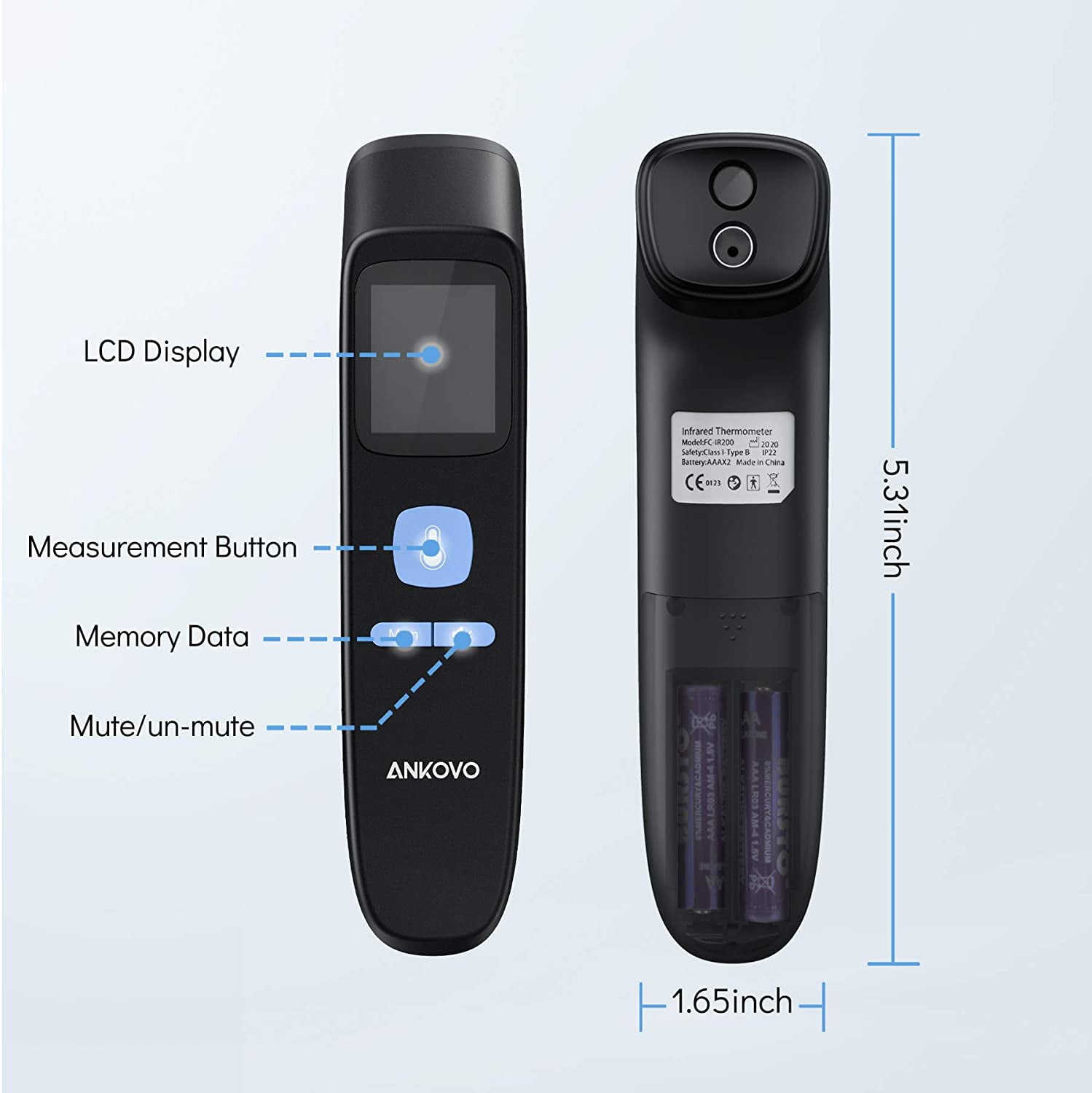 Ankovo Forehead Thermometer Ankovo forehead thermometer is accurate and convenient by German infrared temperature sensor. Light spot positioning will make a safe and hygienic measurement of temperature. Large LCD displays help you get the temperature at night. Suitable for adults, kids and babies. Multi-functional can measure forehead, ear, basal, room, milk, water and object temperature. Ankovo digital thermometer built-in German infrared laser temperature sensor, microprocessor, distance field sensor and temperature compensation are used for calibration. Instant reading in 1 second, with accuracy between 0.2℃/0.4℉. Why this thermometer is best chosen non-contact infrared measurement. Clinical accuracy measurement. One-button operation. Light spot positioning. German infrared temperature sensor. Large LCD display. Object & room measurement. Ankovo focuses on new technology health products. We always pay attention to people’s body and protect their health. Package contents: 1 x Infrared Thermometer 1 x Pouch 2 x Battery (AAA) 1 x User manual 1 x Quick package contents