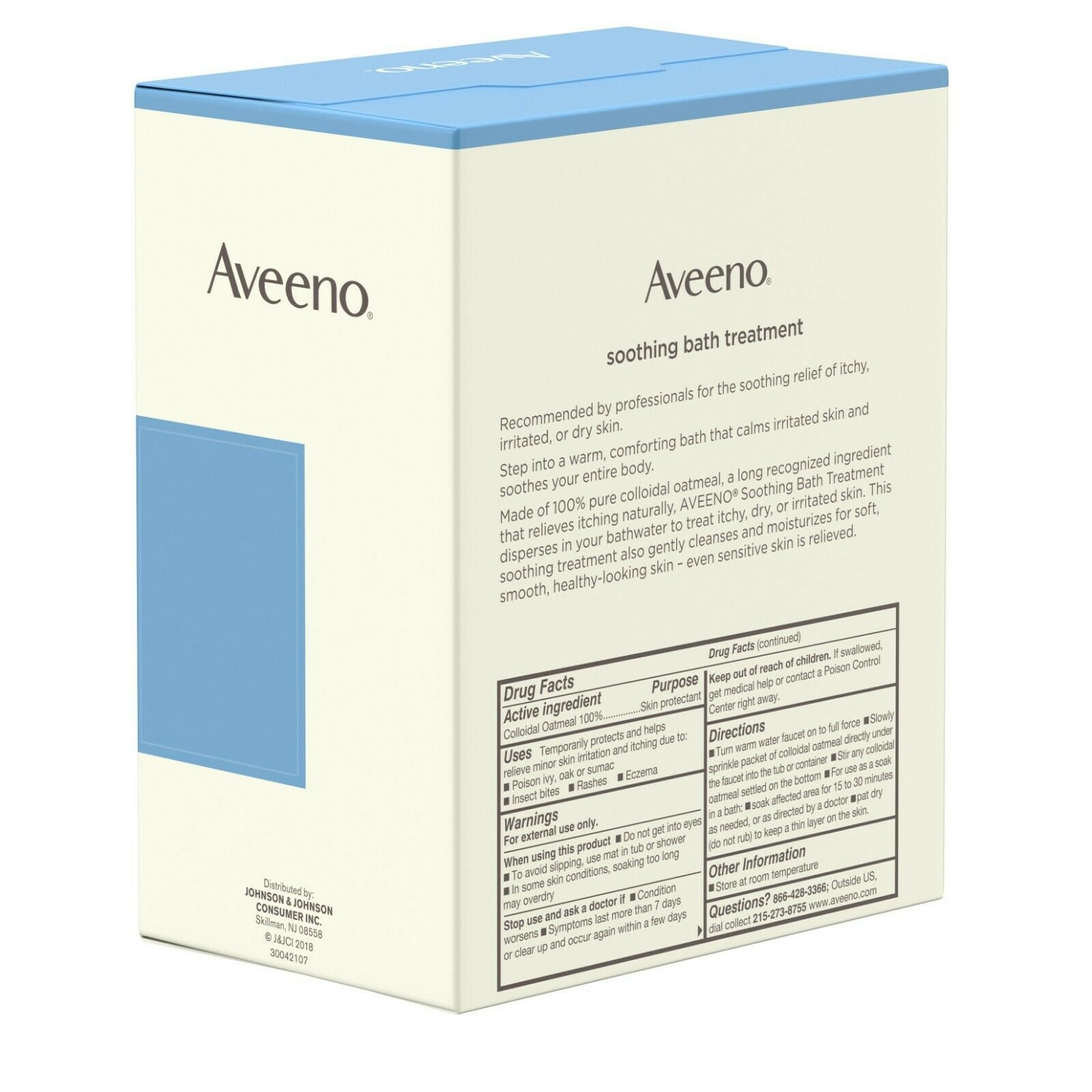 The AVEENO brand has been dermatologist recommended for nearly sixty years. Active Ingredients: Colloidal Oatmeal 100% Uses: Temporarily protects and helps relieve minor skin irritation and itching due to: Poison ivy, oak or sumac. Insect bites. Rashes. Eczema. Recommended by professionals for the soothing relief of itchy, dry, or irritated skin, this bath treatment is made of 100% pure colloidal oatmeal – a long recognized ingredient that relieves itching naturally. In the unique bath products from Aveeno, natural colloidal oatmeal is milled to an ultra-fine powder. When dispersed in water, this powder forms a soothing milky bath. Works as a natural cleanser and cleans the skin without soap. Surface soils adhere to the ultra-fine colloidal oatmeal particles and gently rinse away. After bathing, skin becomes softer and smoother and itchy, sensitive skin is relieved. Relieves itchy, irritated skin due to: poison ivy/oak/sumac, rashes, insect bites, eczema. Soothes: prickly heat, chicken pox, hives, sunburn. Fragrance free. Dermatologist recommended.New Package World Wide