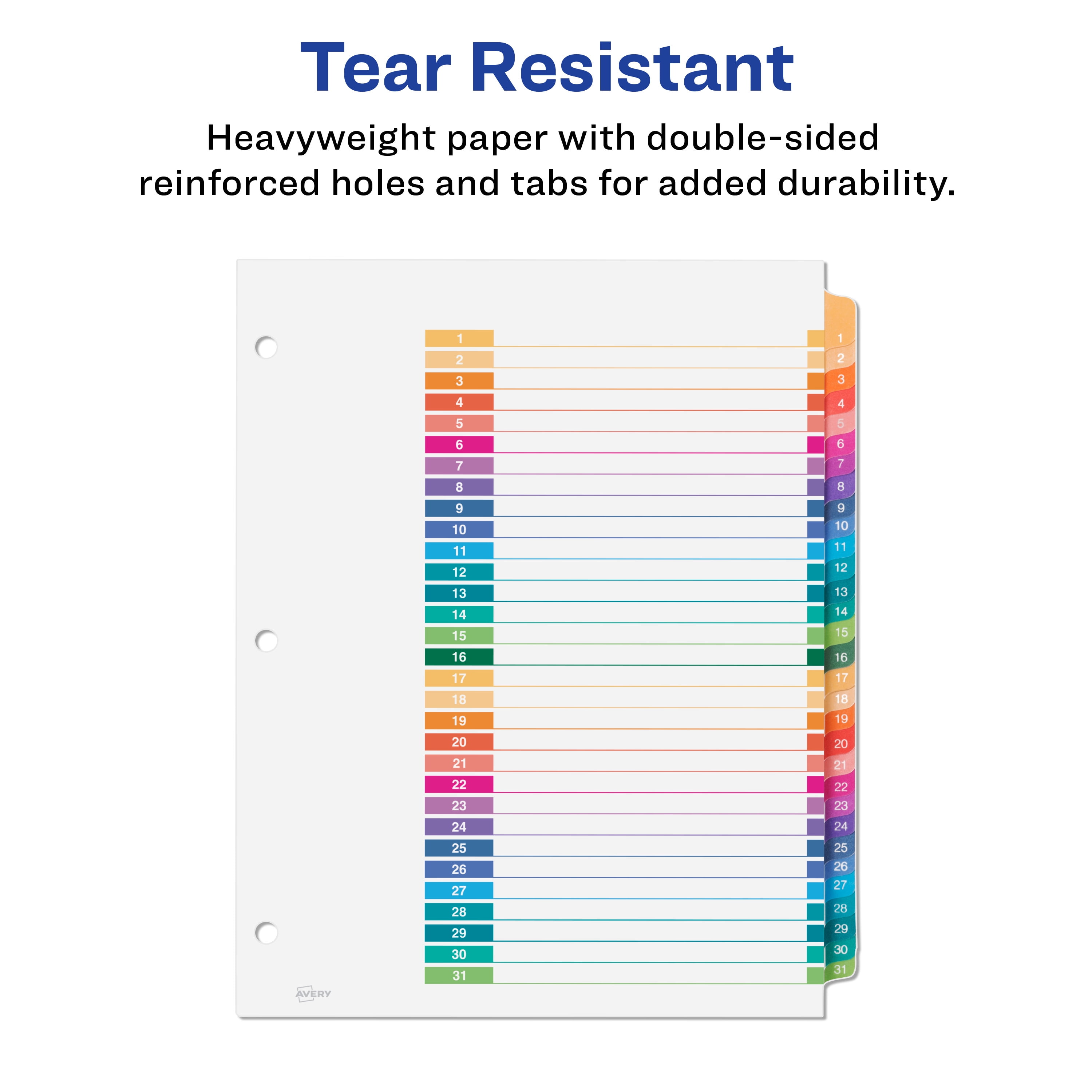 Organize your projects in moments with Avery Ready Index binder dividers. Each tab is preprinted and uniquely color coded for a professional appearance. Print your own custom section titles and images onto the table of contents sheet without worrying about labels or inserts. Whether you’re creating planners for classes or hosting a presentation, these dividers are ideal for getting everything sorted. 6 sets of 31 dividers are included with each sheet measuring 8-1/2"x11". The 3 binder holes are reinforced on both sides of the heavyweight sheet to prevent creasing and tearing. Each divider tab includes additional reinforcement along the edge of each page to distribute stress and resist folding. The printable table of contents is dual compatible with both laser and inkjet printers. This sheet can also be printed in either portrait or landscape so that your projects can be displayed in any orientation. Just flip the sheet to view the other layout on the opposite side. Try out free templates for these dividers and check out the Avery Design & Print software at avery.com/templates.