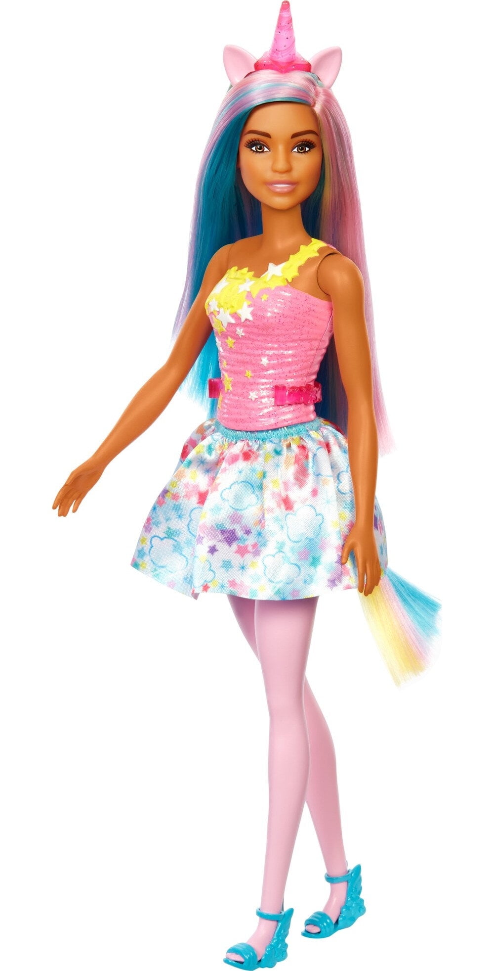 Enter a world of magical storytelling with Barbie Dreamtopia Unicorn Dolls! This Barbie doll features a rainbow-bright look, complete with blue and pink fantasy hair, a sparkly bodice and removable skirt with a cloud and star print. With a clip-on tail and a glittery unicorn headband with adorable ears, kids can transform Barbie doll into their favorite fairytale creature! Colorful shoes and painted-on tights inspire even more fantasy fun. With vibrant looks and a fantastical transformation, Barbie Dreamtopia unicorn dolls inspire endless storytelling for kids ages 3 years old and up. Each sold separately, subject to availability. Doll cannot stand alone. Colors and decorations may vary.