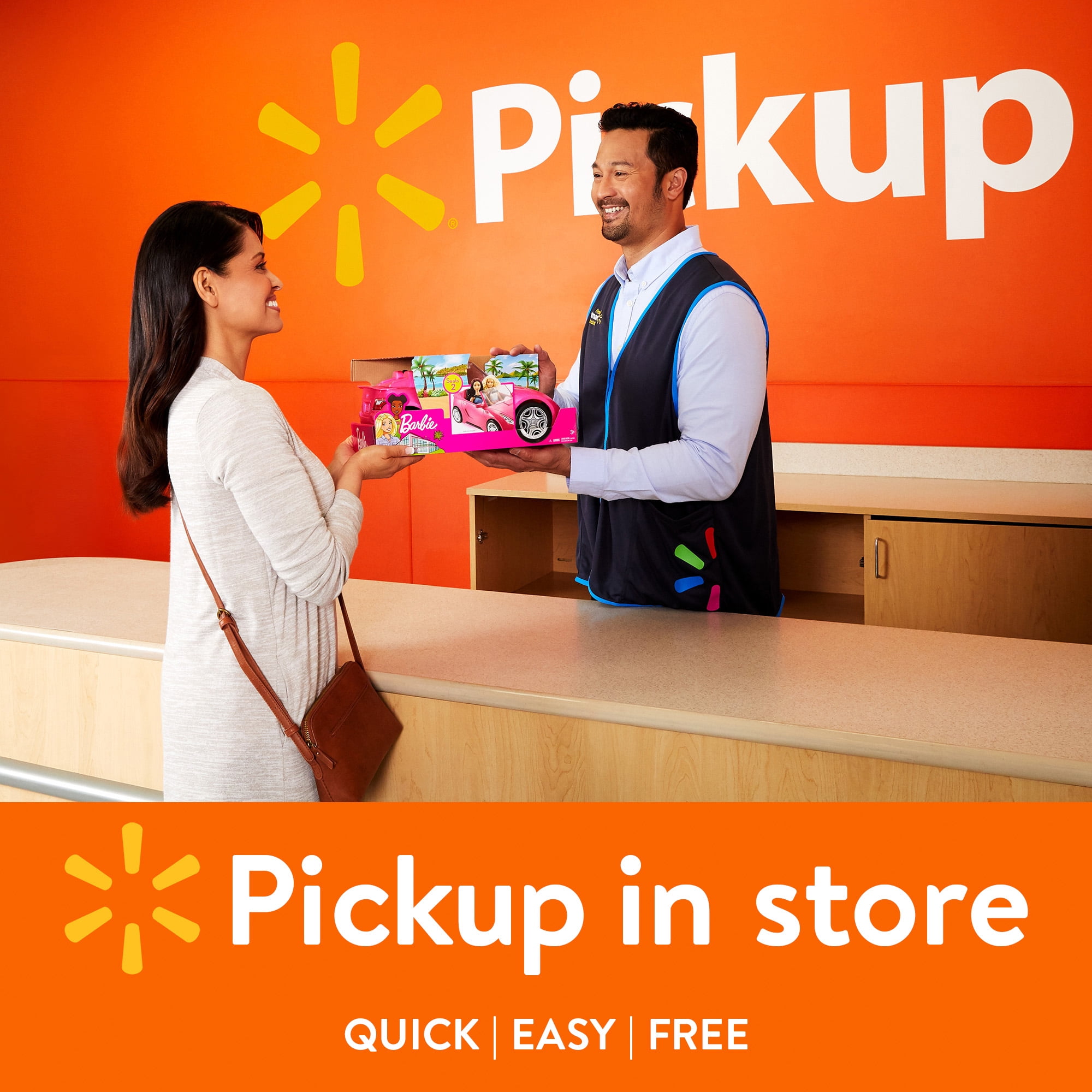 Hit the open road with the Barbie convertible – the storytelling possibilities are endless! Designed in sparkly pink with the Barbie silhouette as hood ornament, the two-seater vehicle is Barbie signature style. The cars sporty shape has a spoiler in back and silvery wheels that really roll. The interior is modern in black with realistic upholstery labels and seatbelts for the dolls (sold separately). Push the convertible to drive wherever imagination can take you because with Barbie, anything is possible! Includes Barbie glam convertible; doll not included. Colors and decorations may vary.