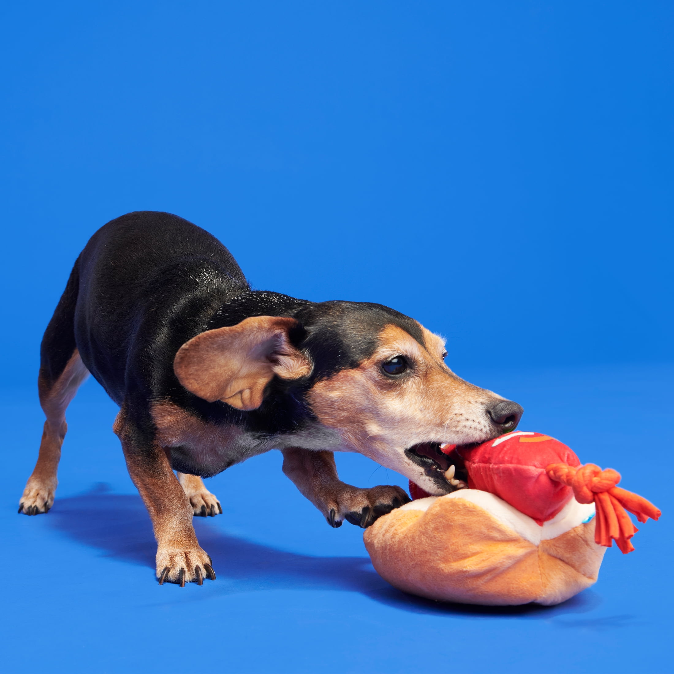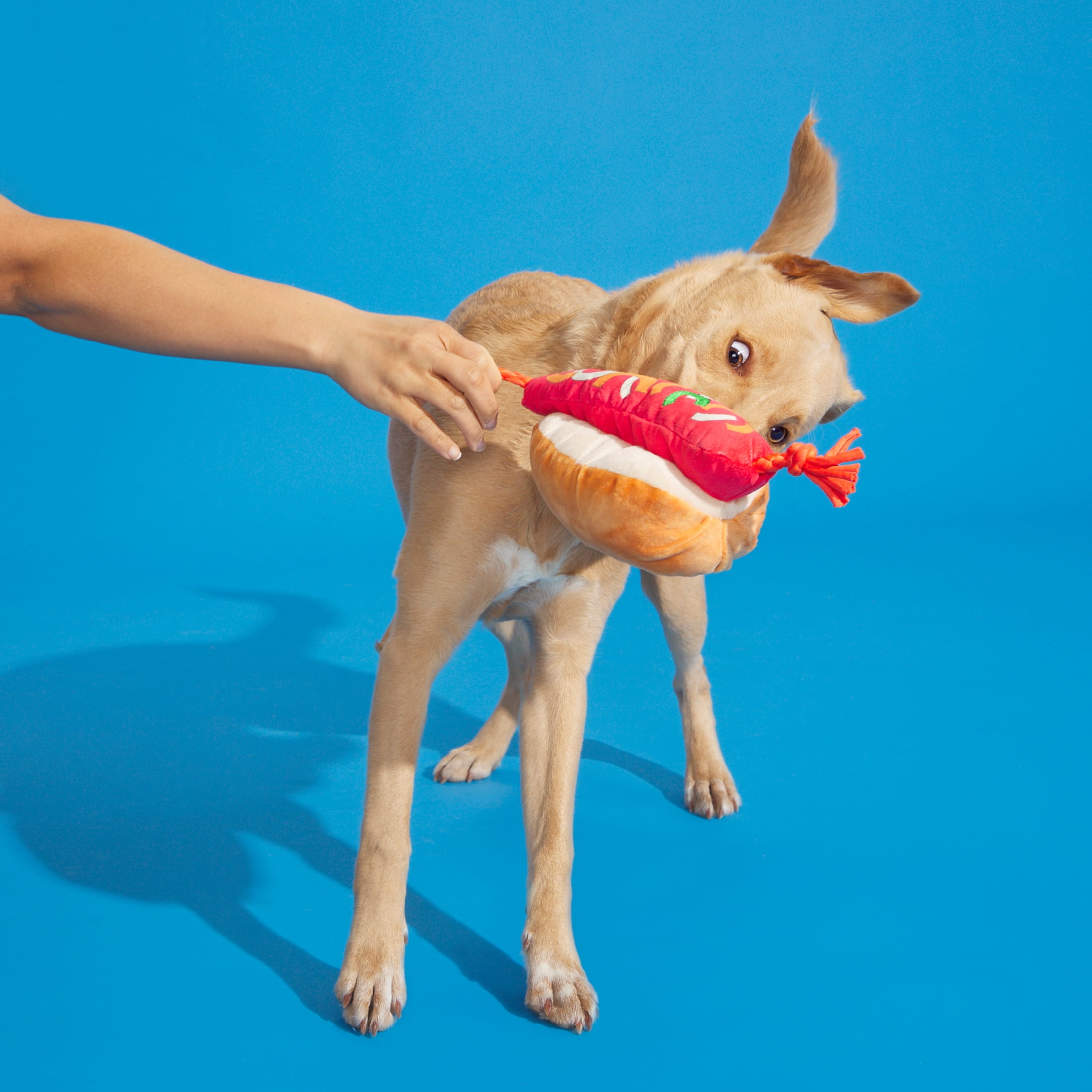 This hot dog, um, dog toy is loaded with all kinds of secret ingredients. Of course The Everything Dog has all the classics, like squeakers and crazy crinkle. But who puts T-shirt rope on their hot dog? Well, we did! Now you and your dog can have a tug-o-war match to see who’s the real weiner. This BARK original toy is part of our Yankee Doodle Dogs collection, which we salute, one nation under dog. Made by dog people, for dogs and their people, backed by BARK’s Happiness Guarantee.
