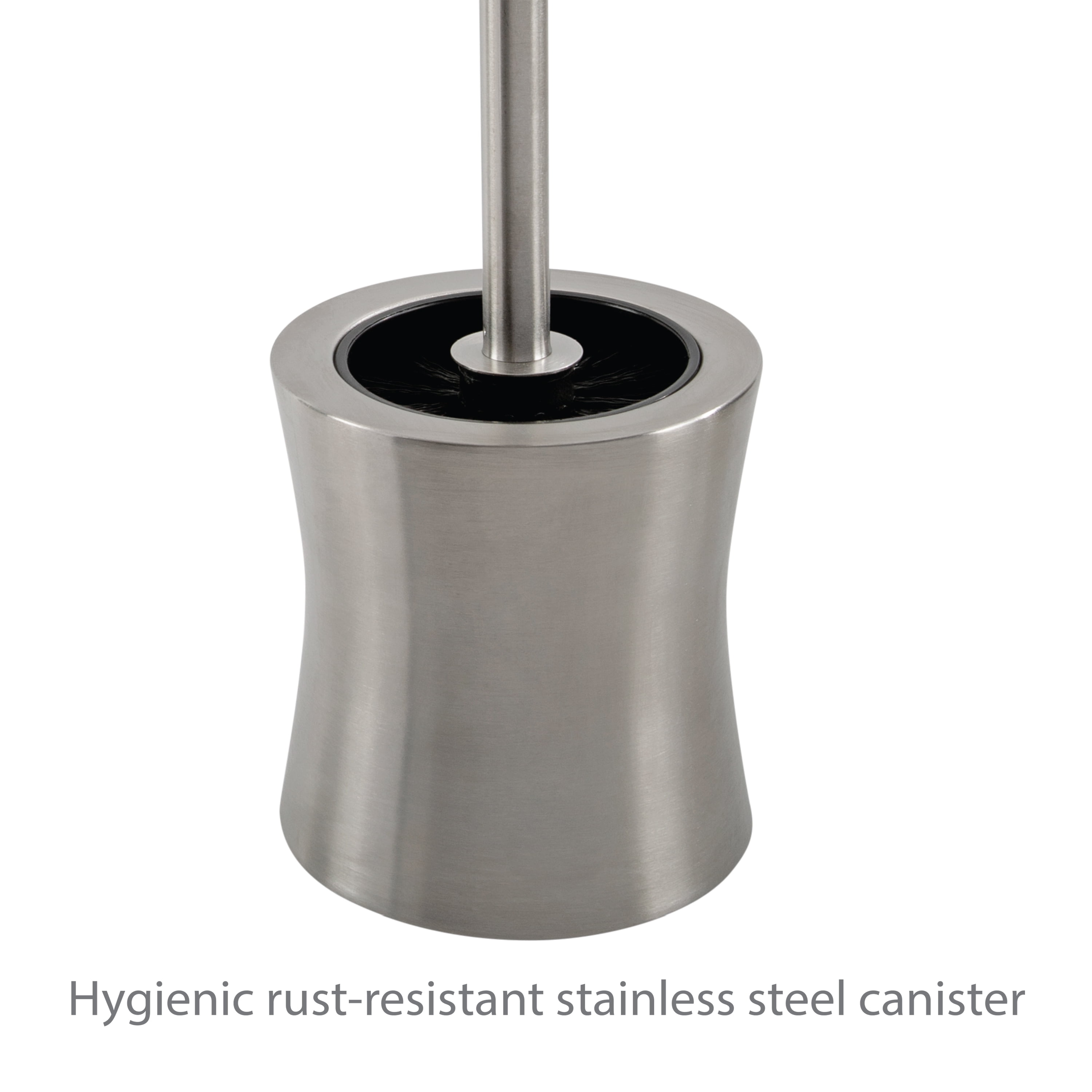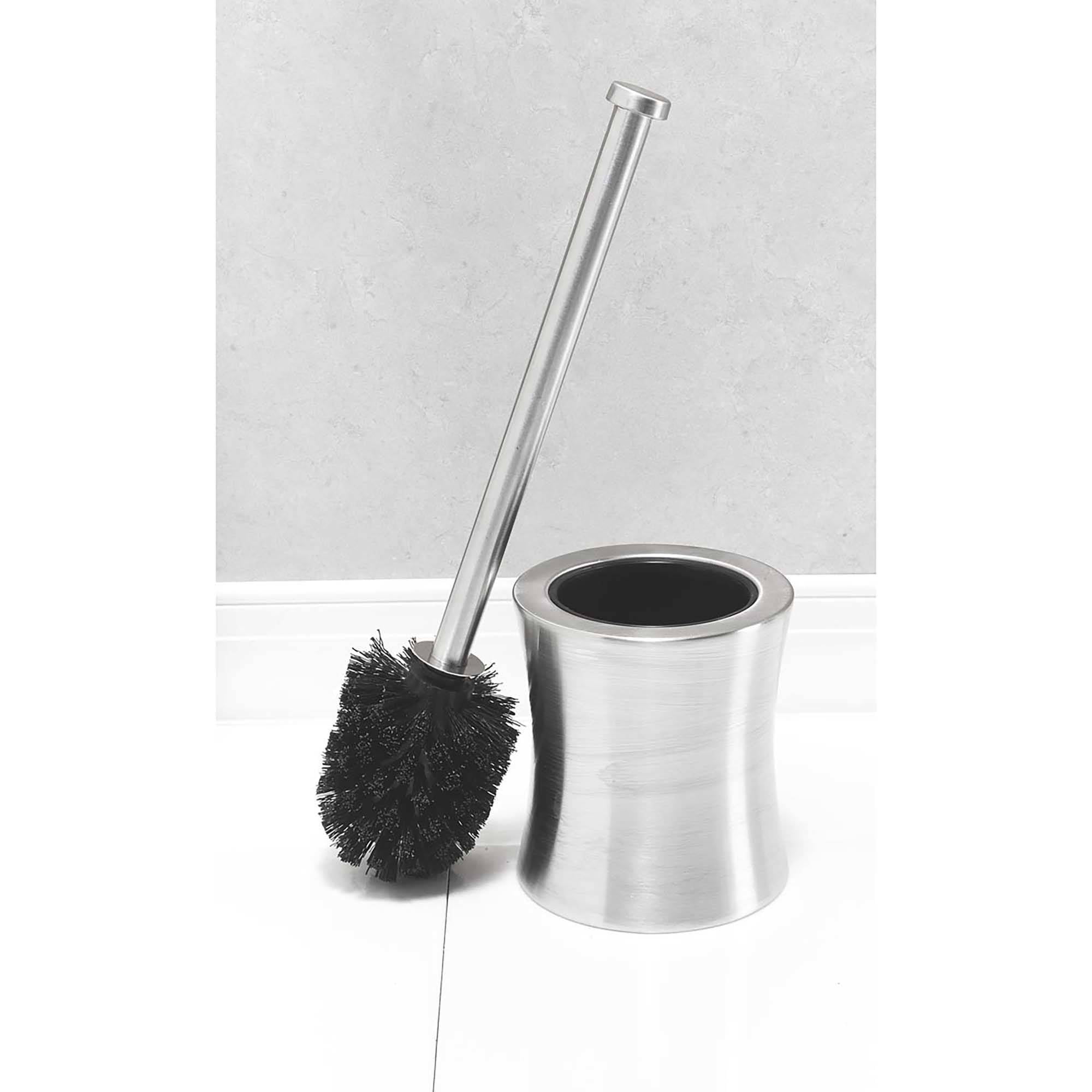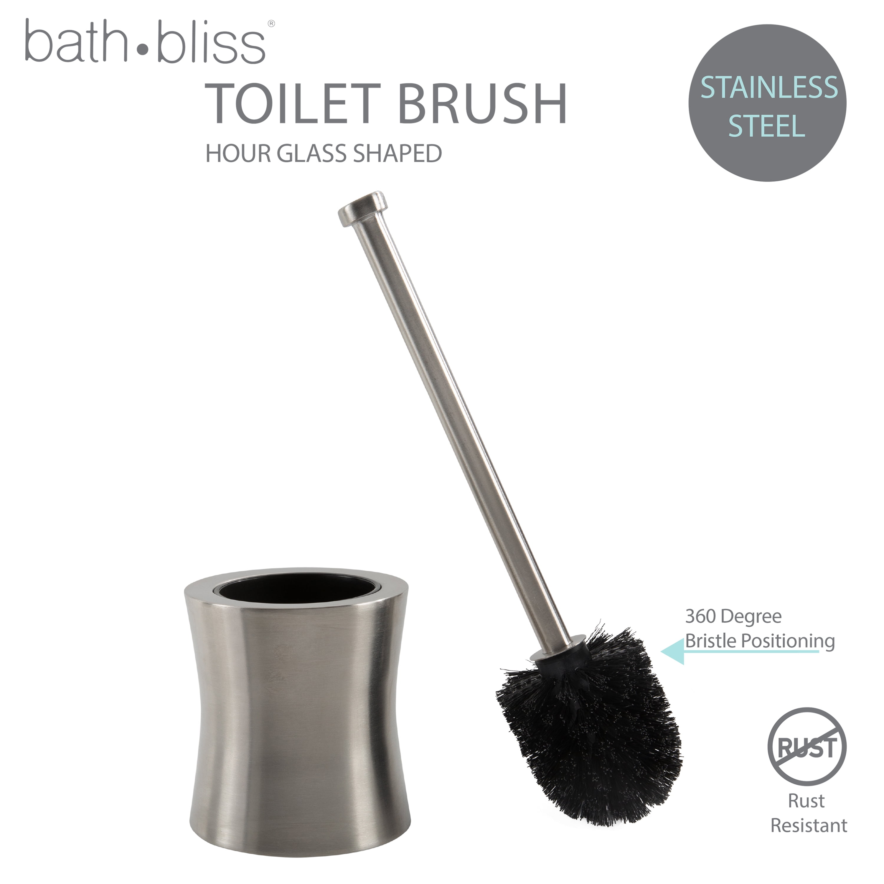 Store your toilet brush in plain sight with the attractive Bath Bliss Toilet Brush Set. This brush and decorative storage container is discreet and will make a lovely accent to most bathroom decors. The handle and canister for the bathroom toilet brush have a slick finish and are constructed from a hygienic and rust-resistant stainless steel. The set also has a durable, rounded, bristle brush that is designed to remain hidden when the product is not in use. This stainless steel toilet brush will keep both your bathroom and toilet looking their best. Treated to resist mildew, bacteria and rust. Hour glass shaped design.