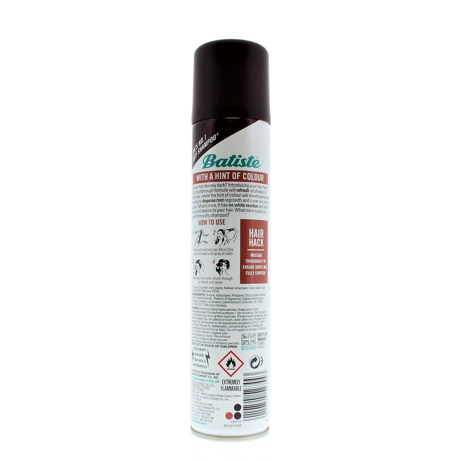 Formulated with a hint of color for darker haired beauties Use between washes to instantly refresh your hair, no water required Waterless formula absorbs dirt and grease to revitalize dull and lifeless hairBatiste Instant Hair Refresh Dry Shampoo Plus Divine Dark 6.73oz/200ml