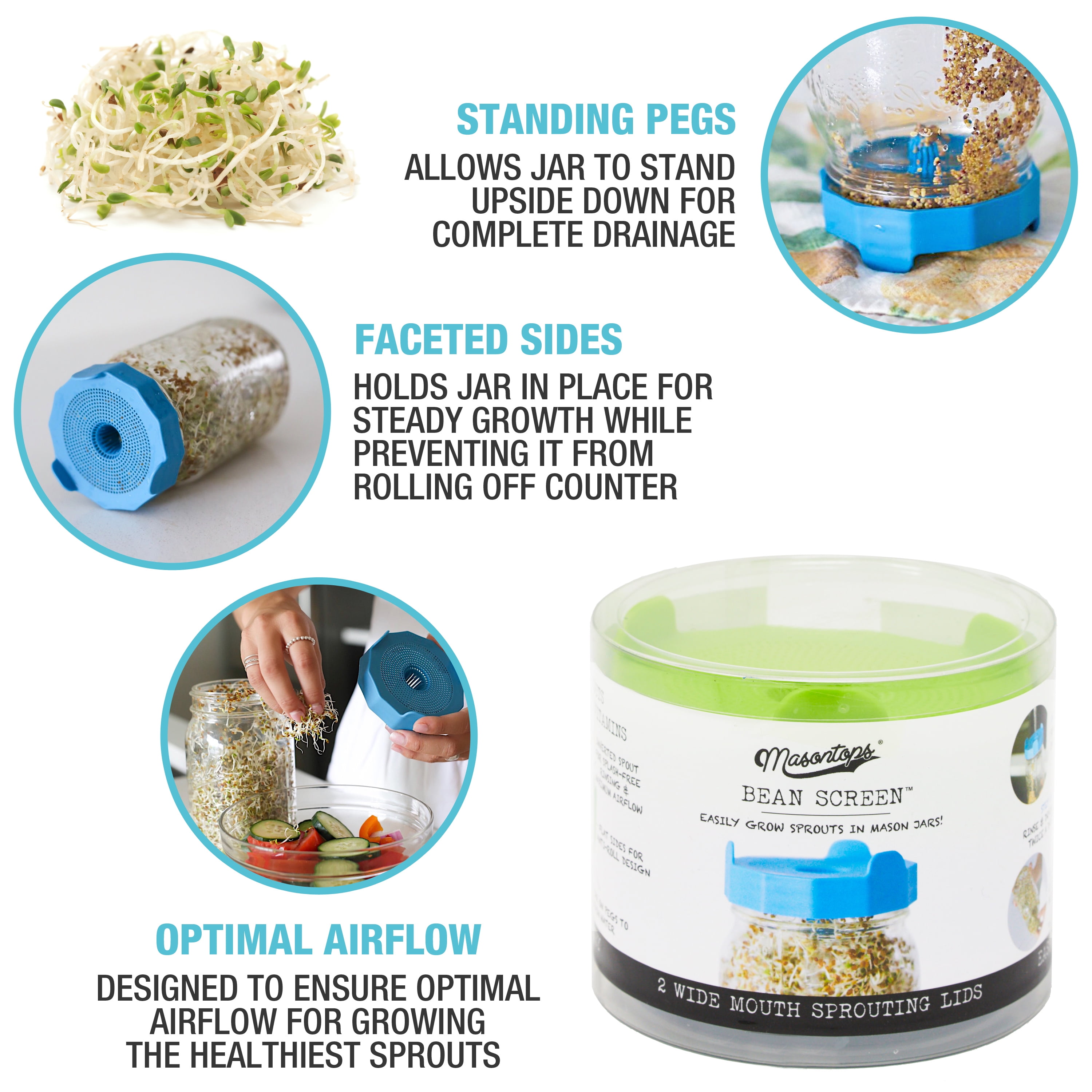 - MAXIMIZE AIRFLOW AND DRAINAGE: Bean Screens have pegs enabling jars to stand on end for complete drainage, inhibiting growth of bacteria. The faceted sides stop the jar from rolling and stabilize the growing environment as the jar rests on its side.