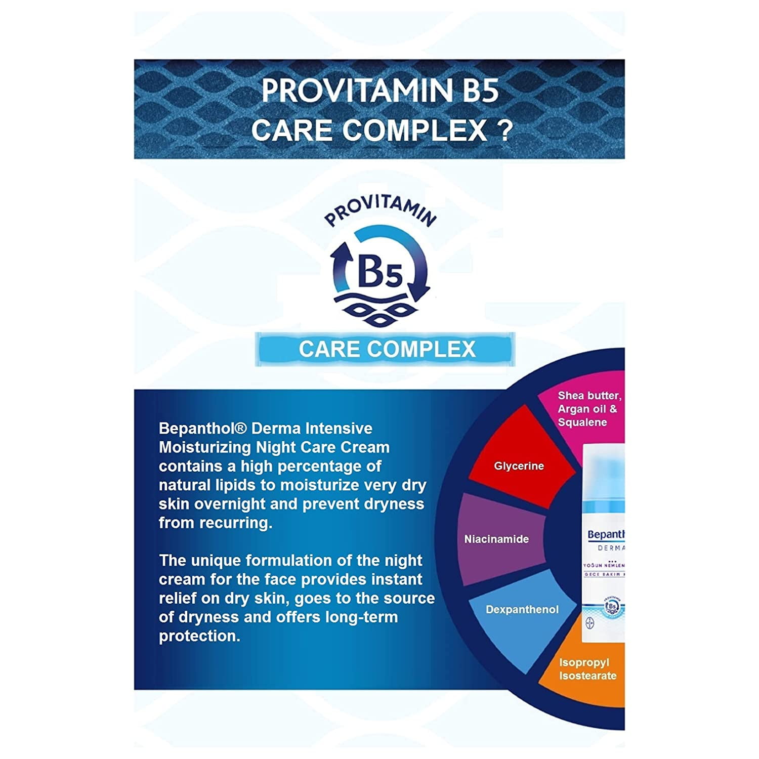 - Bepanthol Derma Intensive Moisturizing Night Care Cream contains a high percentage of natural lipids to moisturize very dry skin overnight and prevent dryness from recurring. The unique formulation of the night cream for the face provides instant relief on dry skin, goes to the source of dryness and offers long-term protection.