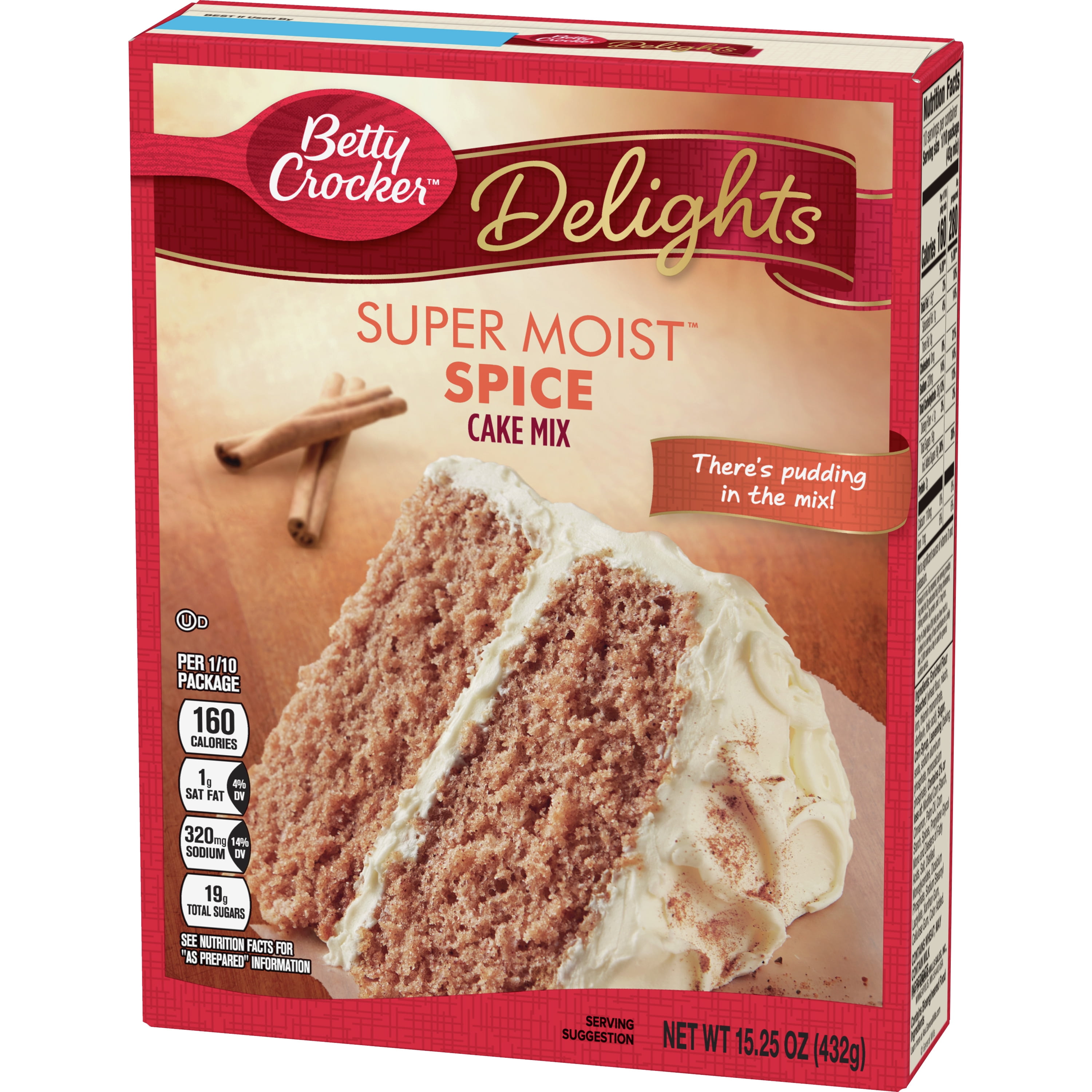 Perfect for a fall dessert, birthday celebration and more, Betty Crocker Delights Super Moist Spice Cake Mix is the easy baking solution to all your sweet treat needs. This spice cake mix is ready to bake in minutes! Top with delicious frosting for a classic take, or try something new with one of Betty Crocker’s many dessert recipes. Plus, it can also be used as cupcake mix! Bring your family together with the perfect balance of sweet flavor and convenience.For more than a century, Betty Crocker has been a popular creator of easy, delicious recipes. Today, the Betty Crocker kitchen is still providing convenient, tasty dessert mixes, frostings, and convenient meal options and side dishes. And today, you can still find those same products you grew up with on grocery shelves.