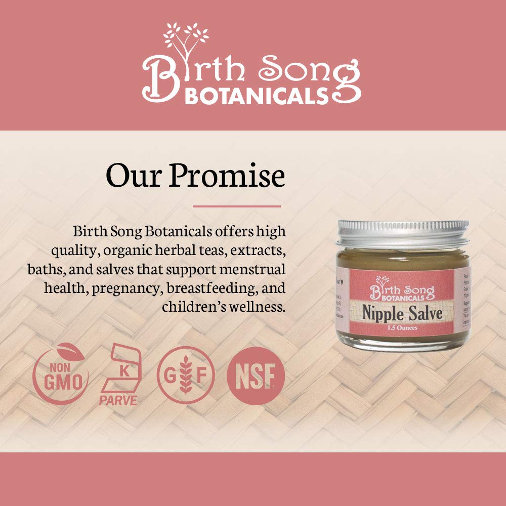 Birth Song’s Organic Nipple Salve helps heal the dry, cracked and painful nipples that come from breastfeeding. Nursing your baby should be a wonderful experience, our all natural balm will help that happen, and our pure ingredients make it safe for baby, unlike some other nipple ointments. See bullets and images for more information.