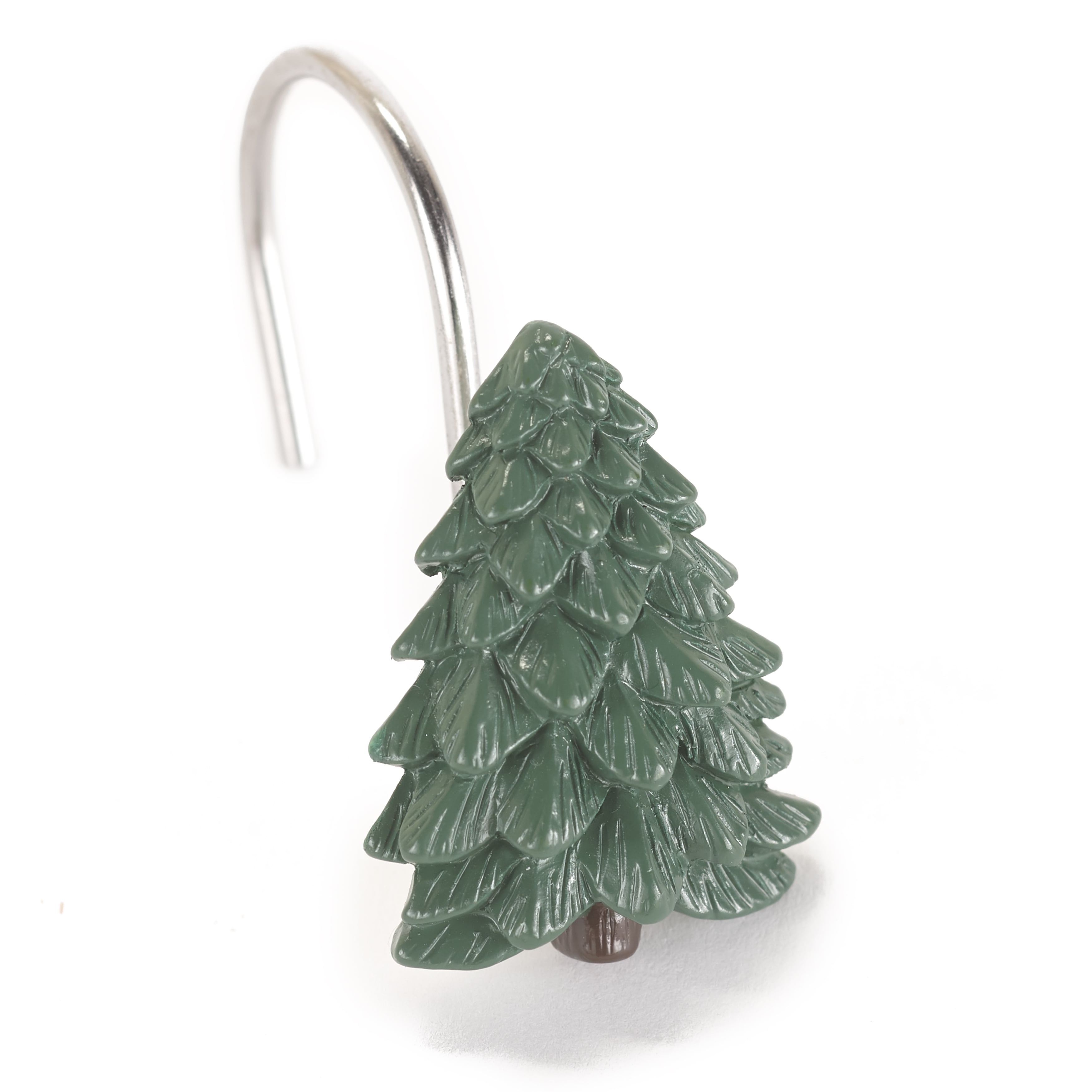 - Included in the set of twelve wilderness accent shower curtain hooks are ceramic decorations in the shape of Evergreen trees, like you would find in the woods.