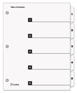 Expanding poly pocket dividers are extra tough with large insertable tabs offer a nonstick, transfer-safe way to organize documents and photos. Large tabs in the five-tab set are designed to provide ample room for titles and are multi-colored for color-coding. Each translucent divider expands to hold 100 letter-size sheets and is designed so paper tab inserts won’t fall out. Scratch-resistant, non-transfer matrl is PVC-free and safe for all documents and photos. Paper inserts are included for convenience. Three-hole punched to fit any standard binder.