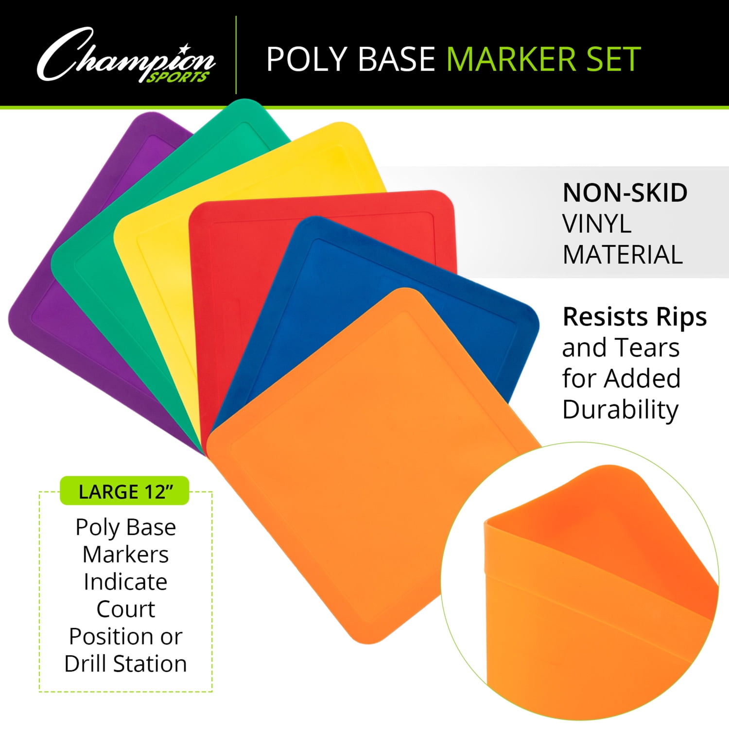 These versatile Champion Sports Poly Base Markers can be used for a variety of drills and games. They are great for setting up training stations in gym class or teaching court positioning without the risk of injury or obstruction. Made of non-skid vinyl that won’t tear or rip, this pack of six base markers comes with one each in red, orange, yellow, green, blue and purple.