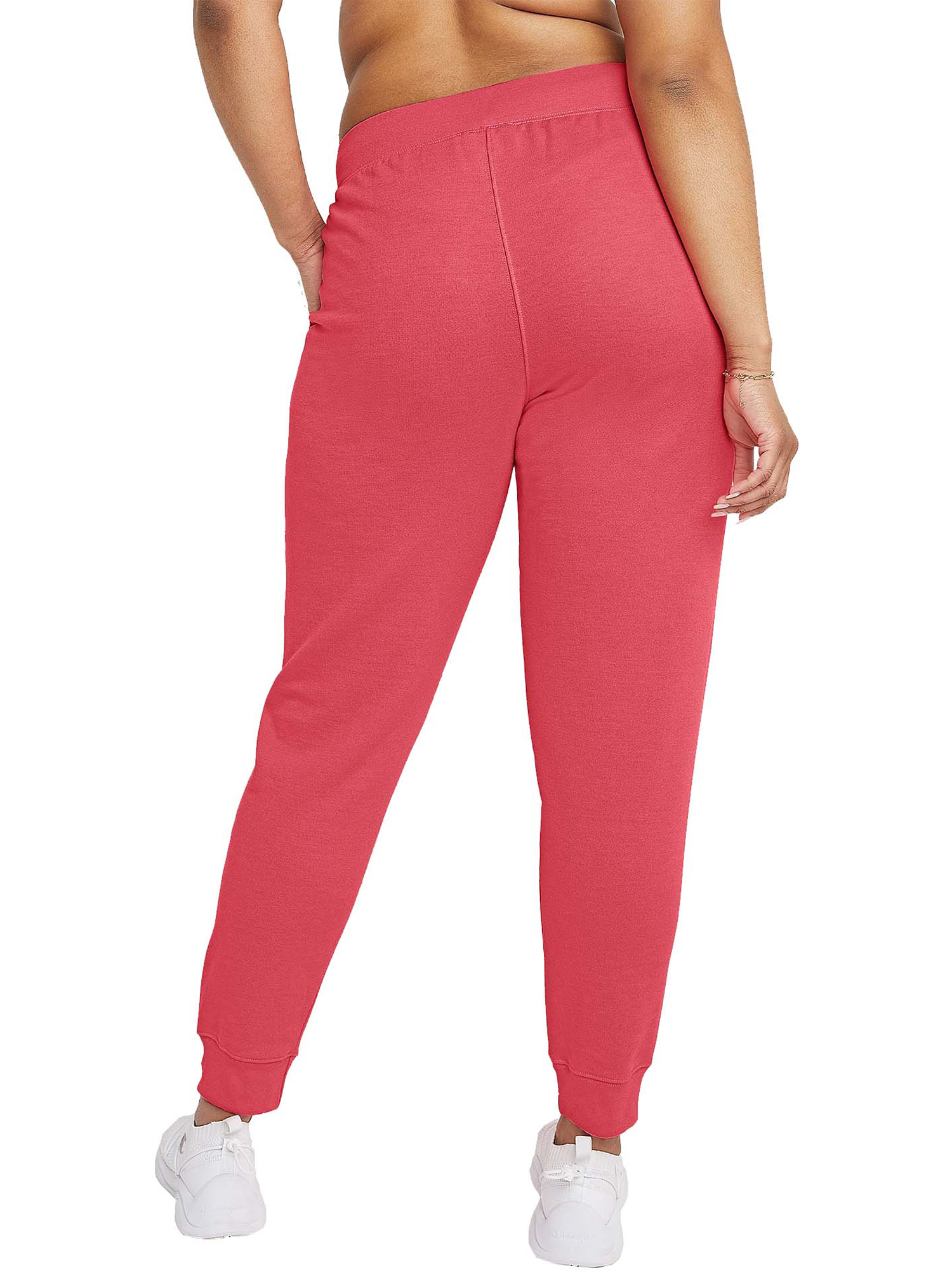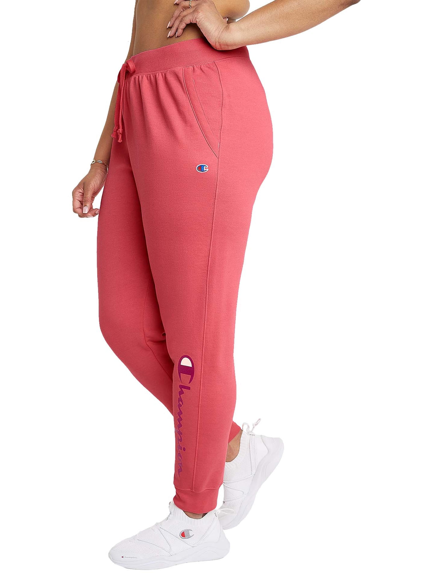 JOGGERS TAKE YOU FROM WORKOUT TO CHILL OUT IN COMFY STYLE. Keep your athletic vibe going from the gym to the street to chilling at home in our Powerblend® Joggers made to fit everyone in sizes up to 4X. The classic women’s fit and tapered leg add a retro pop of style to cropped tees and jackets. Powerblend fleece is exceptionally soft with less shrinkage and pilling. Part of our Champion® Made initiative, joggers are made with traceable U.S. grown cotton that requires 2 to 5 less water. Even better, we use a portion of recycled polyester fibers, which helps keep plastic bottles out of landfills. 29" inseam. Drop shadow foil script logo on the leg elevates your sport style.