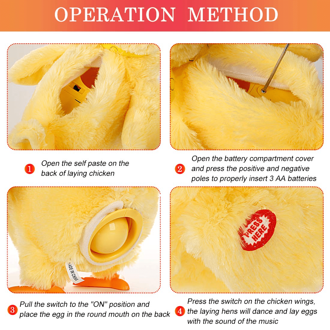 - â¦Package Includes: Mother Hen and 3 Eggs(not included Batteries)please check the package,if you have any problems.feel free to contact me