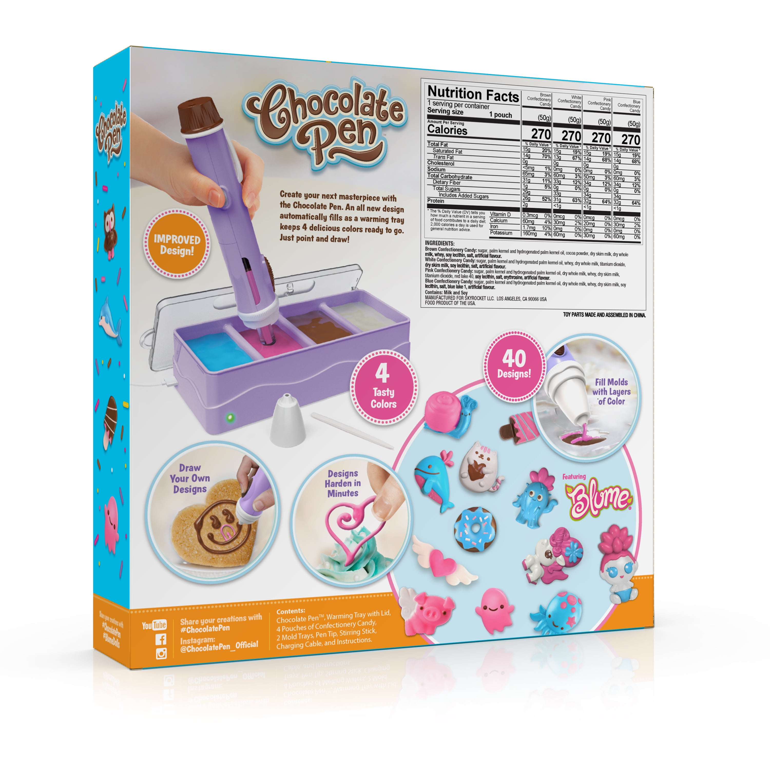 Create in delicious style with the better-than-ever Chocolate Pen! New kid-friendly design automatically loads the pen with chocolate while the warming tray keeps your candy melted and ready to go. At the touch of a button you can write words, draw one-of-a-kind designs, or use the 40 molds to make rainbows, hearts and other fun shapes, including bonus molds inspired by Blume Dolls. Kid chefs will love adding their chocolatey touches to fruit, cookies, cupcakes, or anything else their sweet tooth desires! Your DIY creations will magically harden in minutes and make a perfect gift for friends and family to enjoy. Craft kit includes 1 Chocolate Pen, Drawing Tip, Warming Tray with Lid, 4 Tasty Colors, Stirring Stick, 40 Mold Designs, Charging Cable and Instructions.