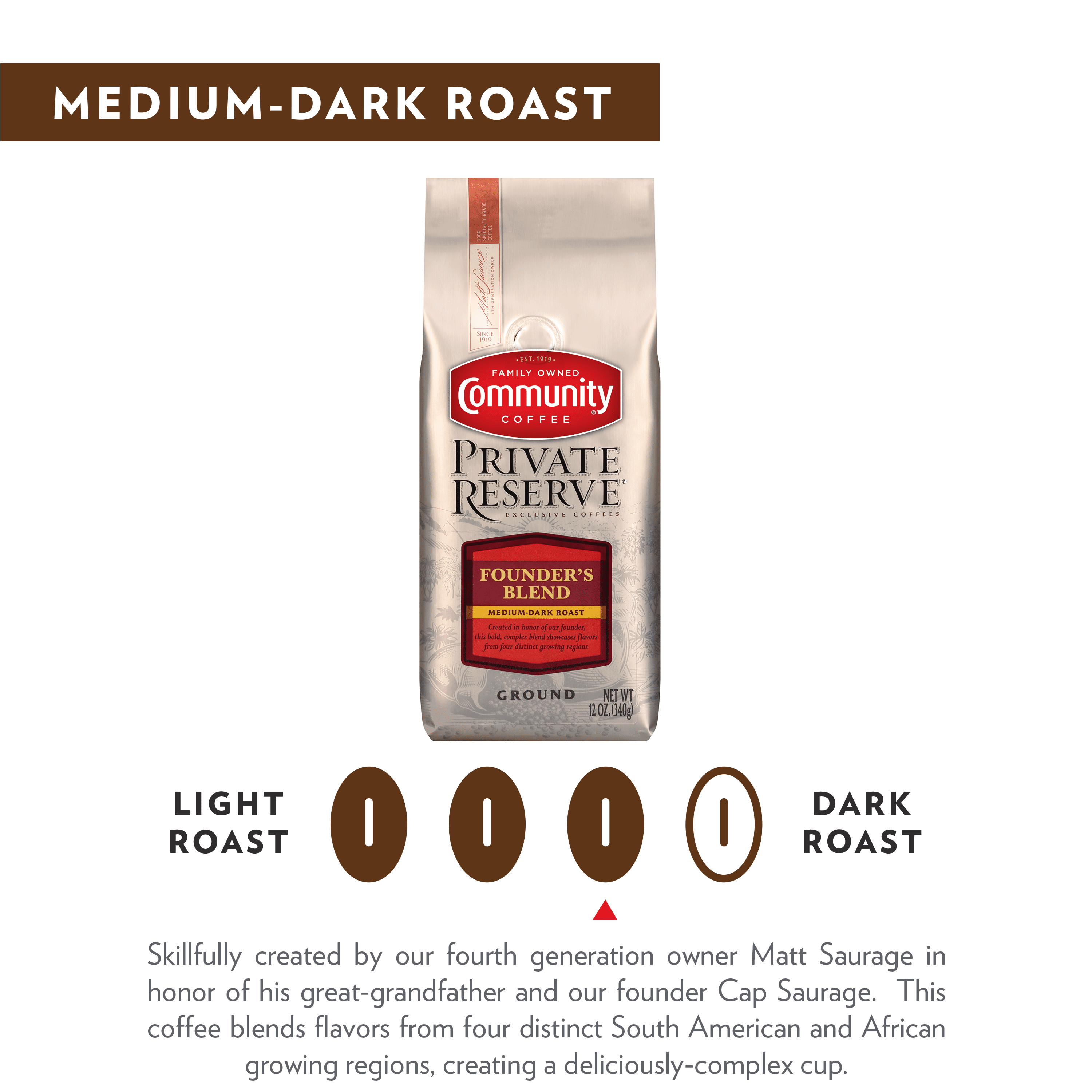 Created in honor of our founder, this bold, complex blend showcase, flavors from four distinct growing regions.
