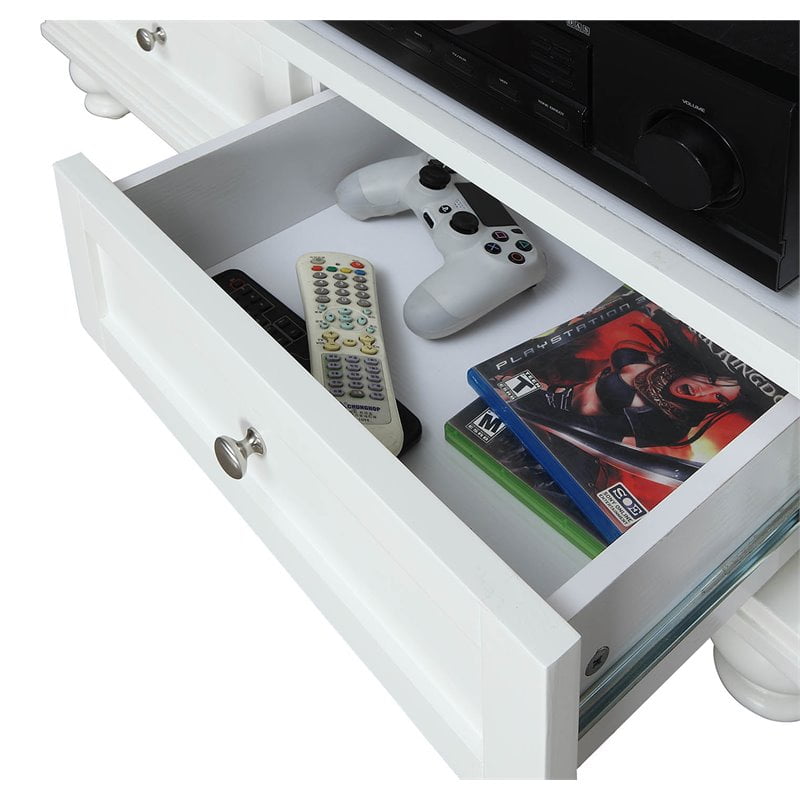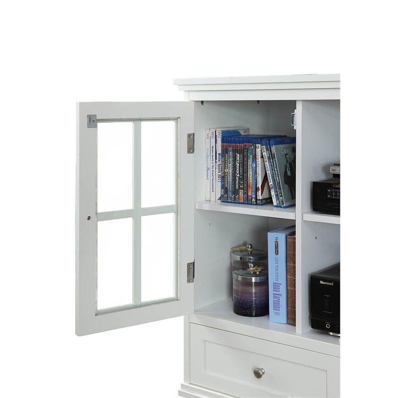The beautiful Designs2Go Tahoe Highboy TV stand is a great addition to any home. Featuring 2 open shelves and cable management, you’ll have plenty of space to organize your media consoles. The built-in cabinet with a tempered glass door will showcase all your media components while keeping everything neat and tidy. The amount of storage doesn’t end there with two additional bottom drawers that slide seamlessly to hide any odds and ends. With wood legs and antique brass knobs and a beautiful finish, your family will be sure to enjoy the Tahoe Highboy TV Stand for years to come. Available in multiple finishes.
