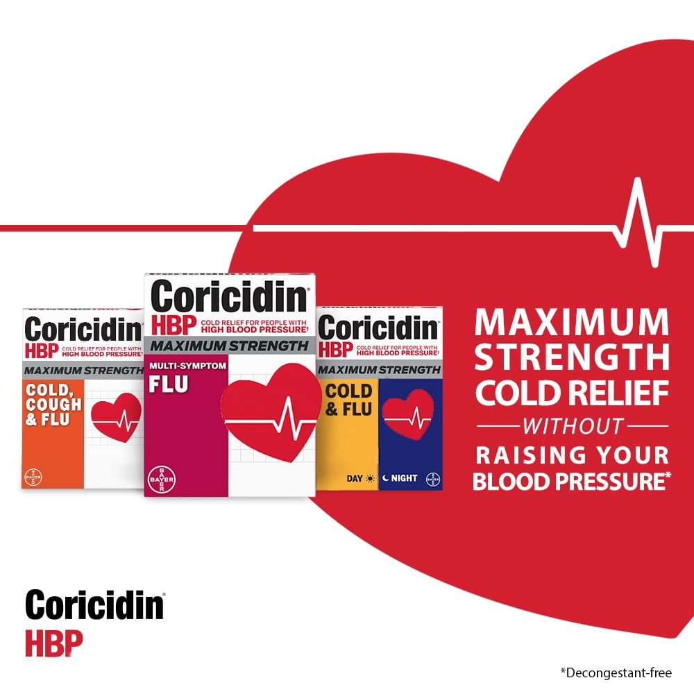 According to the American Heart Association, people with high blood pressure should be aware that the use of decongestants may raise blood pressure or interfere with the effectiveness of some prescribed blood pressure medications. Coricidin HBP Maximum Strength Multi-Symptom Flu is decongestant-free* and provides fast relief from sore throat, cough, fever, runny nose, sneezing, body aches & pains and headache. It’s the #1 selling brand of powerful cold medicine specially formulated for people with high blood pressure. *Based on unit sales