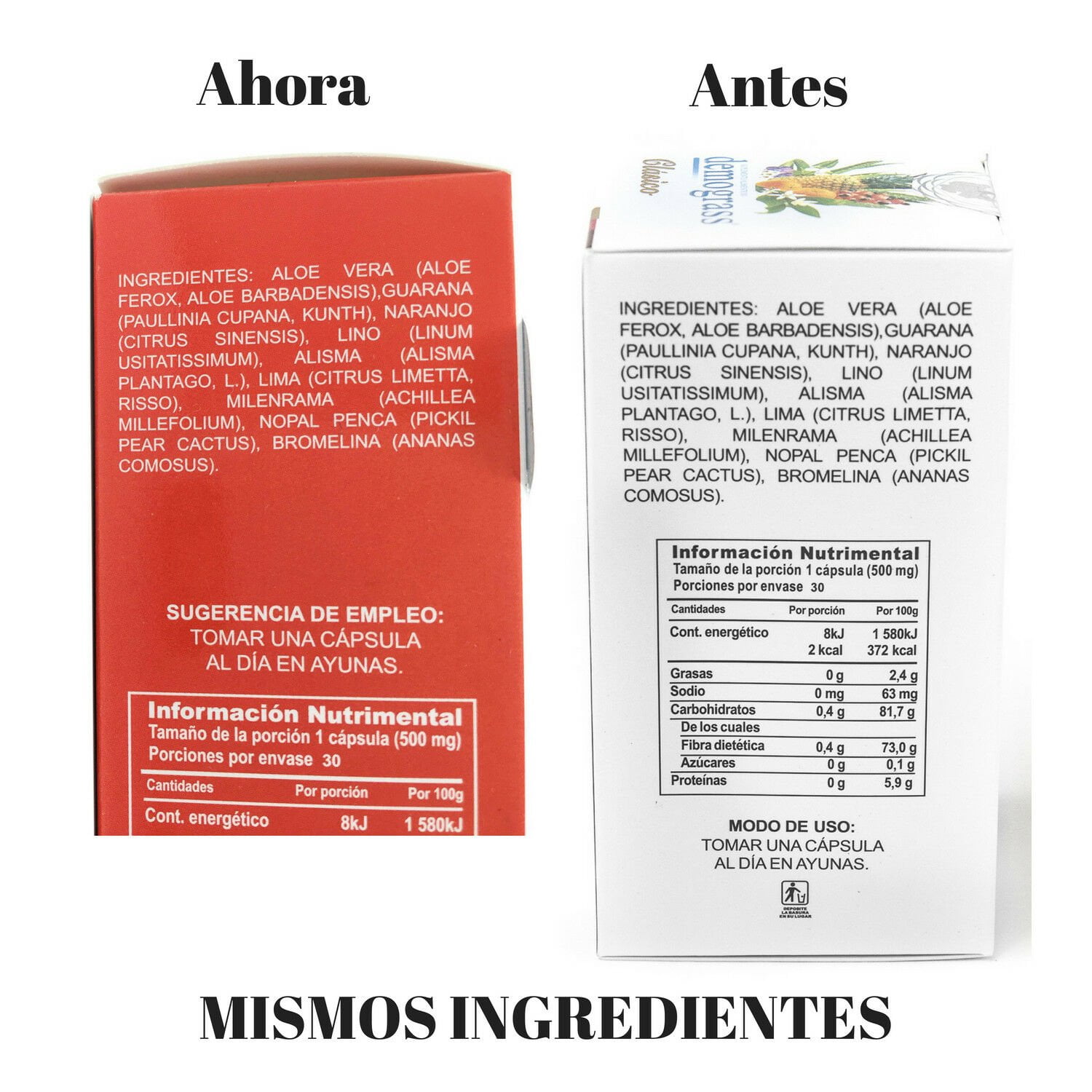 Demograss Clasico es el original Suplemento alimenticio para perdida de peso de Demograss. Contiene 9 ingredientes naturales para la perdida de peso como Aloe Vera, Nopal Penca y Bromelina. Demograss se usa una vez por dia en la manana. Puede ayudar a utilizar grasa en nuestro cuerpo, minimizar la ansiedad de comer y apoyar a la buena digestion. Para mejores resultados toma suficiente agua y come comida rica en potasio o mejor aun use con KPLENTISH MORINGA para evitar dolores musculares.
